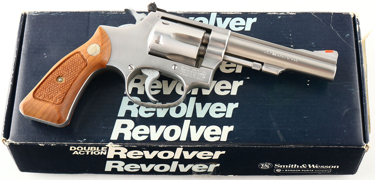 BOXED, Smith & Wesson, Model 651, CAL: 22 RF MAG, MFG: Modern, SN: ABD3964, Double Action Revolver, 4'' barrel. The S&W logo medallion checkered wood grips are excellent. The stainless steel finish is excellent. Bore is excellent. Adjustable rear sight & elevated serrated blade front sight with orange insert. Comes in factory SN matching box, with related paperwork, cleaning rod/tips & wax paper. FFL Req. - Value: 800 to 1300