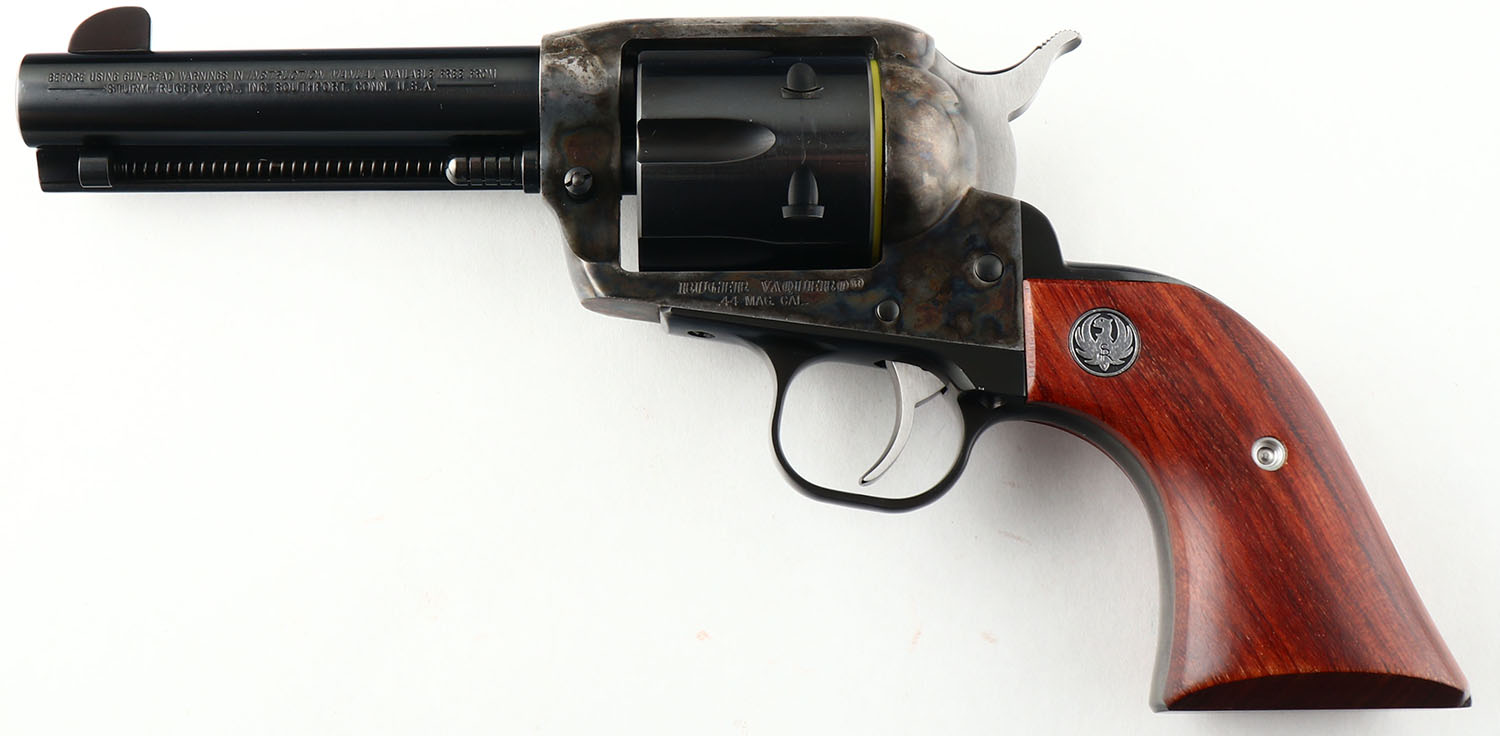 Ruger, Vaquero, CAL: 44 MAG, MFG: 1994, SN: 57-94385, Single Action Revolver, 4 5/8'' barrel. The left side of the barrel is marked with the standard warning & address stamp. The left side of the frame is marked ''RUGER VAQUERO/ .44 MAG CAL''. SN on the right side of the frame. The Ruger logo medallion smooth rosewood grips are excellent. The original blued finish on the barrel, cylinder & grip frame rates 99%. The cylinder has only a faint drag line. The case-colored frame is excellent. Bore is excellent. Square notch rear sight & round blade front sight. FFL Req. - Value: 600 to 800