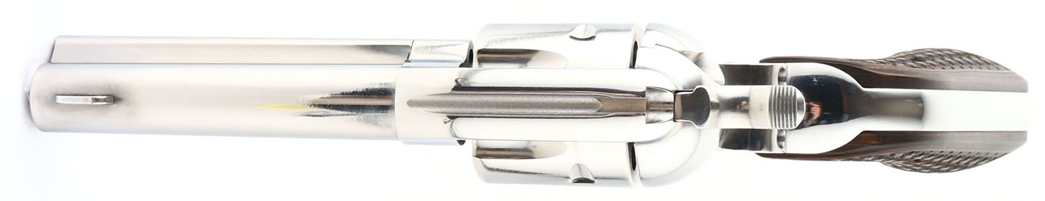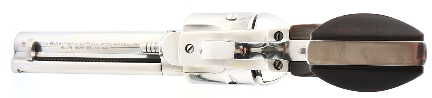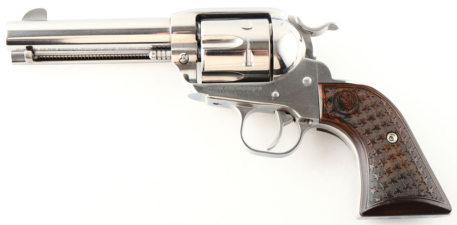 Ruger, New Vaquero - Talo, CAL: 357 MAG, MFG: 2016, SN: 513-00688, Single Action Revolver, 4 5/8'' barrel. The bottom of the barrel is marked with the standard warning & address stamp. The left side of the frame is marked ''RUGER NEW VAQUERO/.357 MAG CAL''. SN on the right side of the frame. The Ruger monogram star engraved wood grips are excellent. The high gloss stainless steel finish is excellent, with fine brush lines from polishing. Bore is excellent. Integral square notch rear sight & dorsal fin blade front sight. FFL Req. - Value: 600 to 850