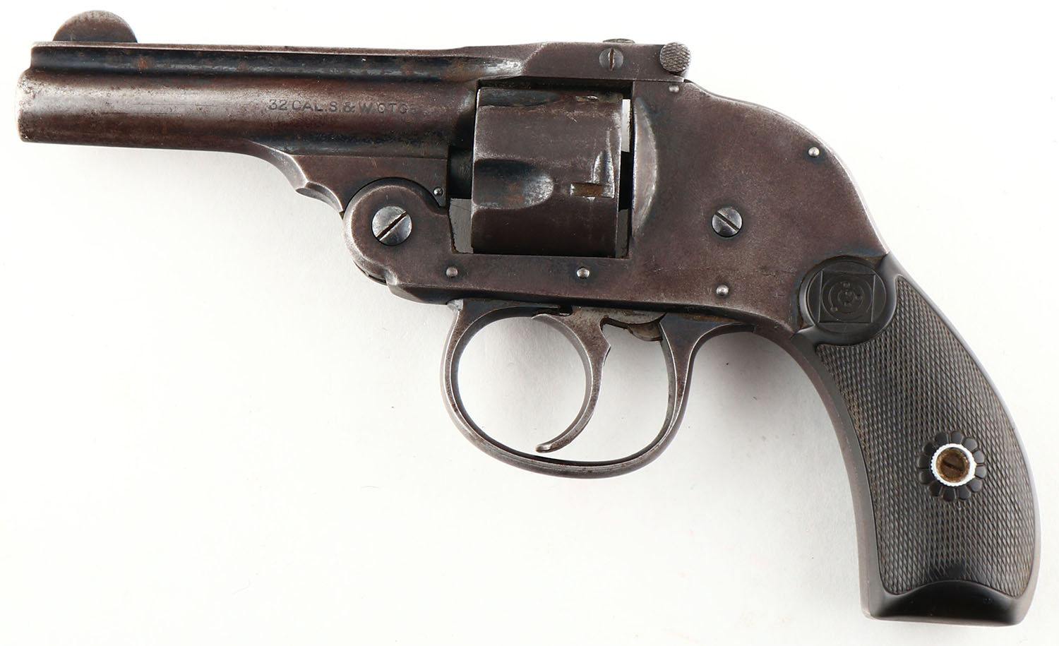 Harrington & Richardson, .32 Hammerless Top Break -Second Model, First Variation, CAL: 32 S&W SHORT, MFG: 1905-06, SN: 102788, Double Action Revolver, 3'' barrel. The Target monogram checkered hard rubber grips are very good & solid. There is consistent handling wear & smooth checkering. The original blued finish has almost fully worn to metal gray & toned to a dark brown patina, with remnants of original blue in protected areas. Bore is good & bright, with spotting, roughness & bulge @ 1 1/4''. Fixed rear sight & blade front sight. FFL or C&R Req. - Value: 50 to 200