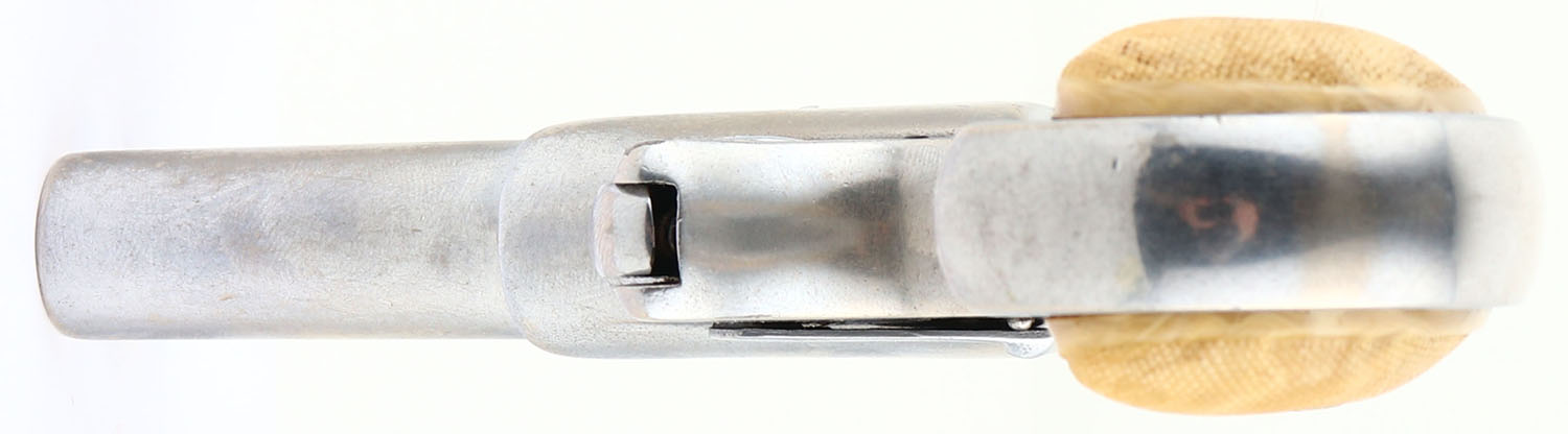 Remington Arms - UMC Co., Model 95 - Double Derringer, CAL: 41 RF, MFG: 1924, SN: L94447, Single Action O/U Pistol, 3'' barrels. The top barrel rib is marked ''REMINGTON ARMS -- UMC CO ILION, N.Y.''. The SN & barrel date code can be seen on the bottom/side of barrel & matching SN is under the left grip. The replacement checkered plastic grips are very good. They fit small to the frame, with noticeable gaps on all sides & there are a couple areas of worn checkering. The restored nickel finish is very good. There is some flaking to edges & visible cleaned pitting under the nickel. Bores are fair, with roughness & pitting amongst thin rifling. Fixed rear sight & blade front sight. FFL or C&R Req. - Value: 250 to 450