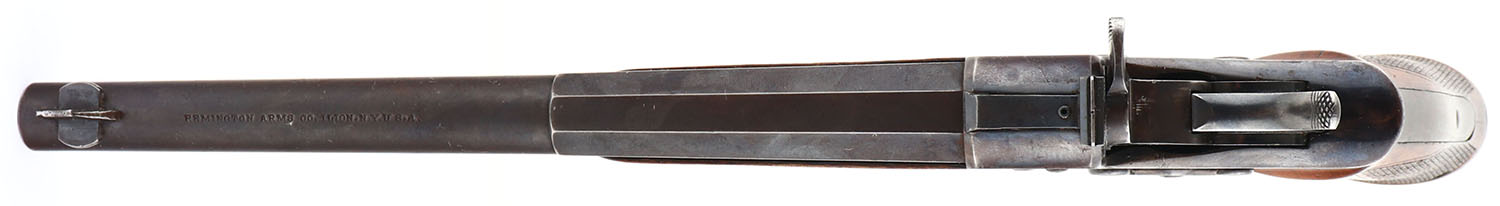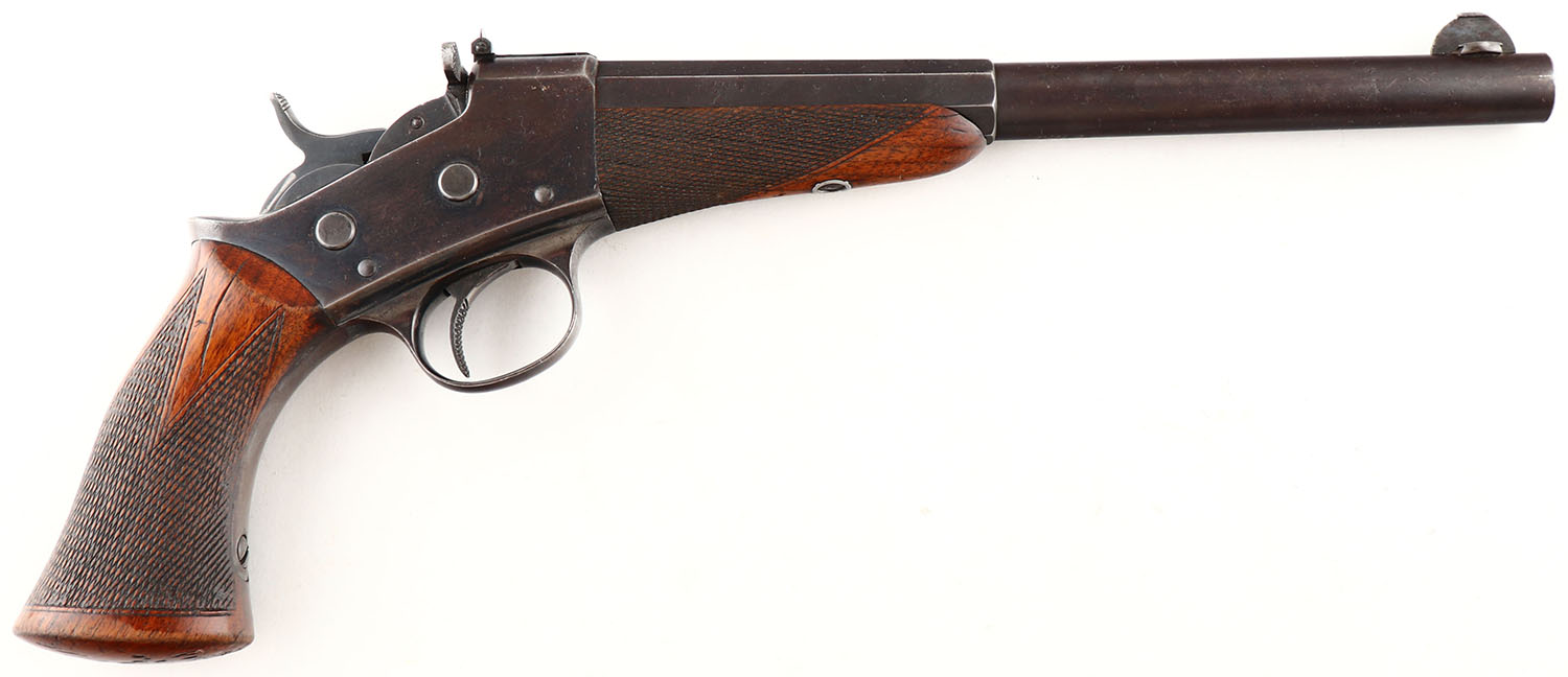 Remington Arms Co., Model 1901 Rolling Block Pistol, CAL: 22 LR, MFG: 1900-1901, SN: 4517 (under grip & barrel), Single Shot Rolling Block Pistol, 10'' half octagon/half round barrel. The top of the barrel is marked ''''REMINGTON ARMS CO. ILION, N.Y.''. The left side of the frame is faintly marked ''''REMINGTON'S ILION N.Y. U.S.A. / PAT. MAY 3D NOV. 15th 1864 APRIL 17th, 1866.'' & ''P S''. The original checkered stocks are very good & solid. There are contusions, dings, scratches & scrapes, with protective oils added over time. The original metal blue finish on the barrel has fully toned to a chocolate patina, with edges worn to metal gray. The original metal blue finish on the frame rates 30%, mostly toned to a brown patina, with blue remaining in protected areas. Bore is very good & bright, with light scarring & thin rifling. Factory rear sight & tall beaded blade front sight. Checkered trigger. Appx 750 produced making these scarce. The ATF classifies these as antiques, as all of these were produced with frames from 1871. Antique, No FFL Req. - Value: 700 to 1000