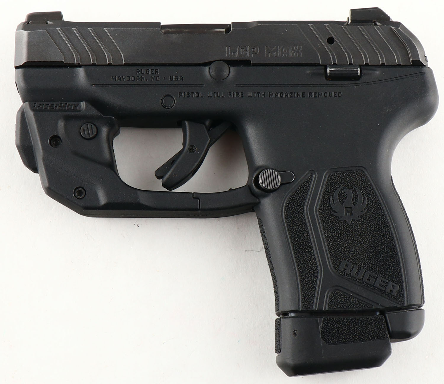 BOXED, Ruger, LCP MAX, CAL: 380 Auto, MFG: Modern, SN: 381357215, Semi Auto Pistol, 2 3/4'' barrel. Standard factory markings. The Ruger textured polymer grip frame is excellent. LaserMax trigger guard extension (needs battery). The matte black finish on the slide rates 99%. Bore is excellent. Serrated rear sight & Tritium front sight. Comes in factory box, with (4) extra mags, Ruger soft holster, lock & related paperwork. FFL Req. - Value: 300 to 450