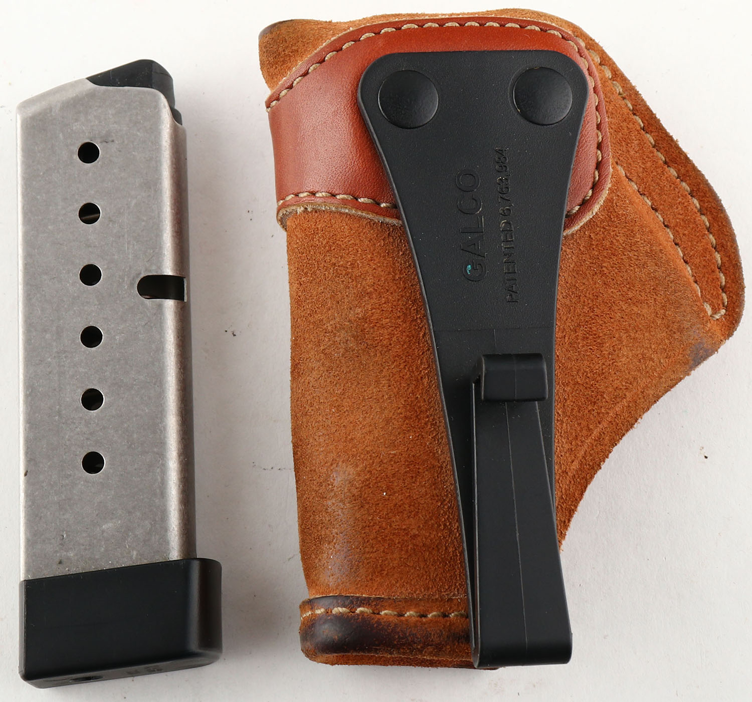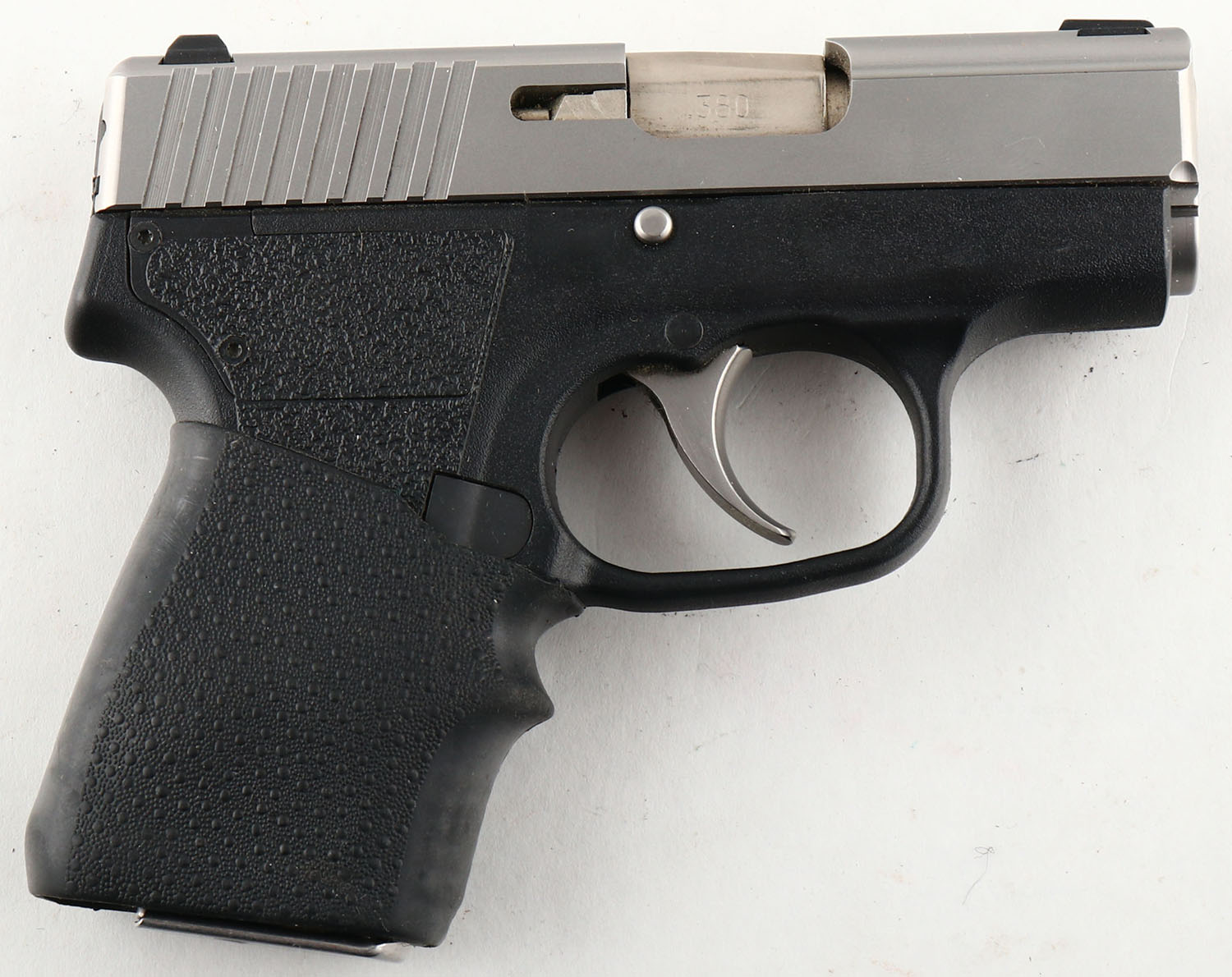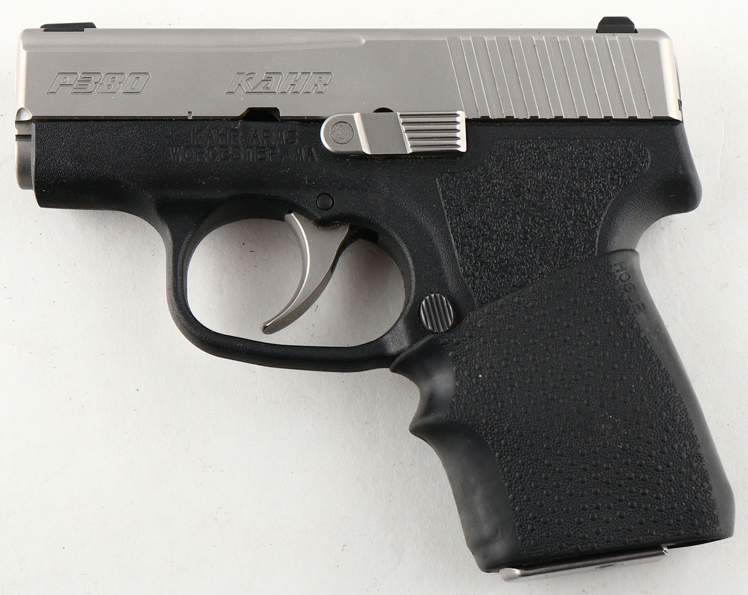 Kahr, Model P380, .380 ACP Semi-Auto Pistol, Mfg. Modern, SN: RC3602, 2 1/2'' barrel, The integrated synthetic grips are excellent, but also comes mounted with finger grip rubber sleeve for improved grip & handling. The matte silver finish on slide, barrel & trigger is 99%, Mechanically sound. Bore is excellent. Comes with original factory 6 rd mag, plus a second extended grip 7 rd mag mag. Comes with a Galco leather clip holster. Excellent overall condition & a perfect small concealed carry pistol. FFL Req. - Value: 300 to 450