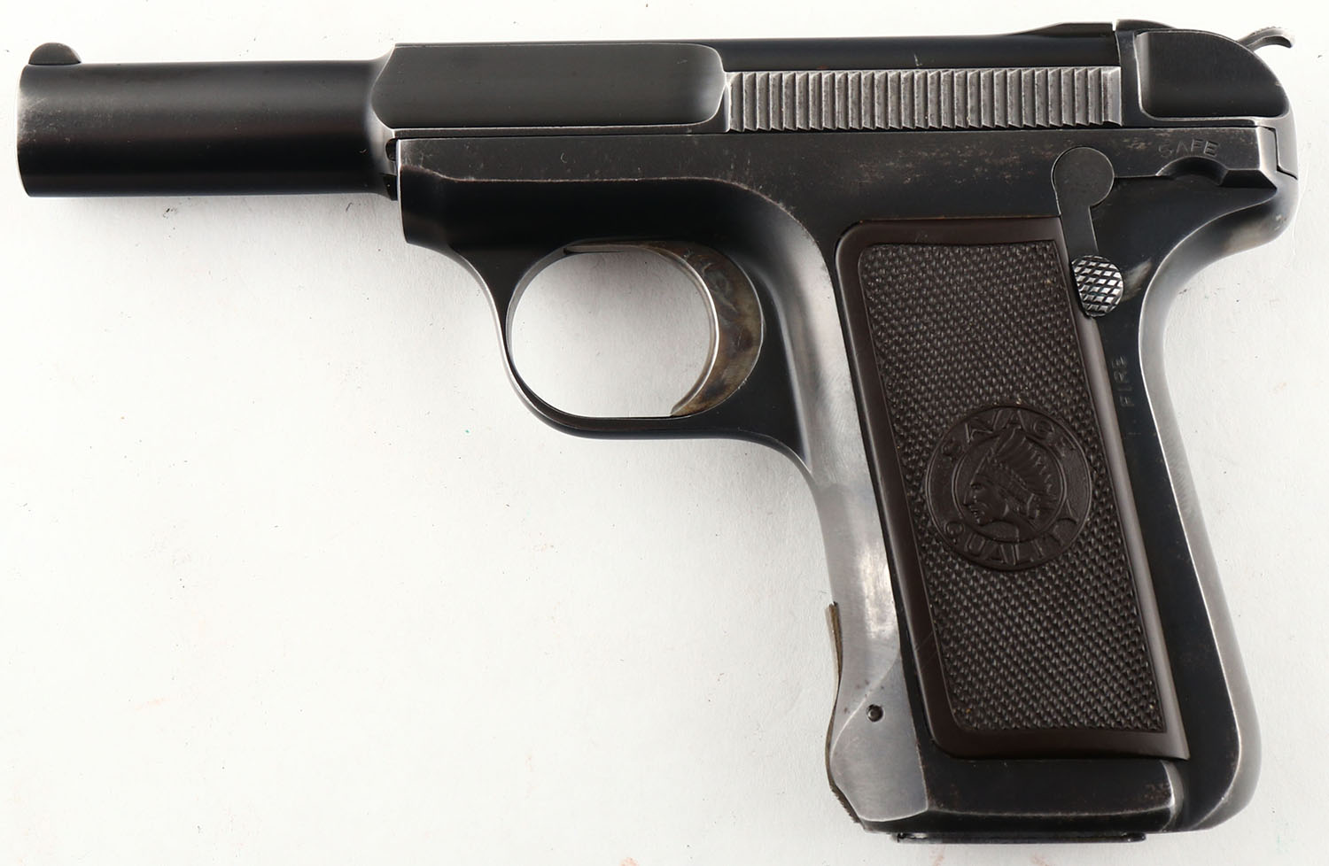 Savage, Model 1907, CAL: 32, MFG: 1920, SN: 225233, Semi Auto Pistol, 3 3/4'' barrel. The original Savage checkered hard rubber grips are excellent. The original blued finish rates 95% on the barrel/slide & 75% on the frame, with concentrated wear to the grip/straps. Bore is very good & bright, slightly hazy. Integral notch rear sight & low profile blade front sight. FFL or C&R Req. - Value: 300 to 500