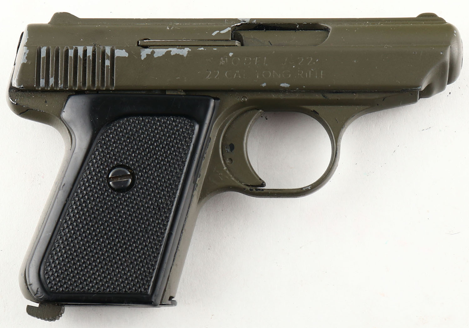 Jennings, J-22, CAL: 22LR, MFG: 1978-Present, SN: 077809, Semi Auto Pistol, 2 1/2'' barrel. The checkered synthetic grips are very good & solid, with visible light wear. There are minor scrapes & dings. The applied matte gray/green finish rates 90% overall, with some flaking. Bore is very good, bright, with visible wear from use. Fixed square notch rear sight & low profile blade front sight. FFL Req. - Value: 50 to 100