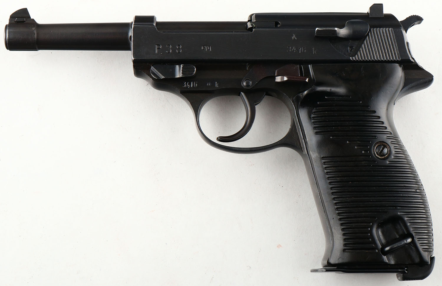 Spreewerk, P.38 Russian Capture, CAL: 9x19mm, MFG: Dec. 1943, SN: 3416K, Semi Auto Pistol, 5'' barrel. The left side of the slide is marked ''P.38'', ''cyq''. ''3416 K''. The left side of the frame is marked ''3416'', ''Waffenampt'', ''k''. The right side of the slide is marked with the import stamp & German proofs. The grooved plastic grips are excellent, with minor scrapes & dings. This example was a Russian capture & carries a Russian re-furbishment mark. The re-furb finish is excellent overall. Bore is good, bright, but with consistent roughness & intermittent pitting. Fixed U-Notch rear sight & blade front sight. Comes with German P.38 holster, carrying an extra mag. FFL or C&R Req - Value: 600 to 1200