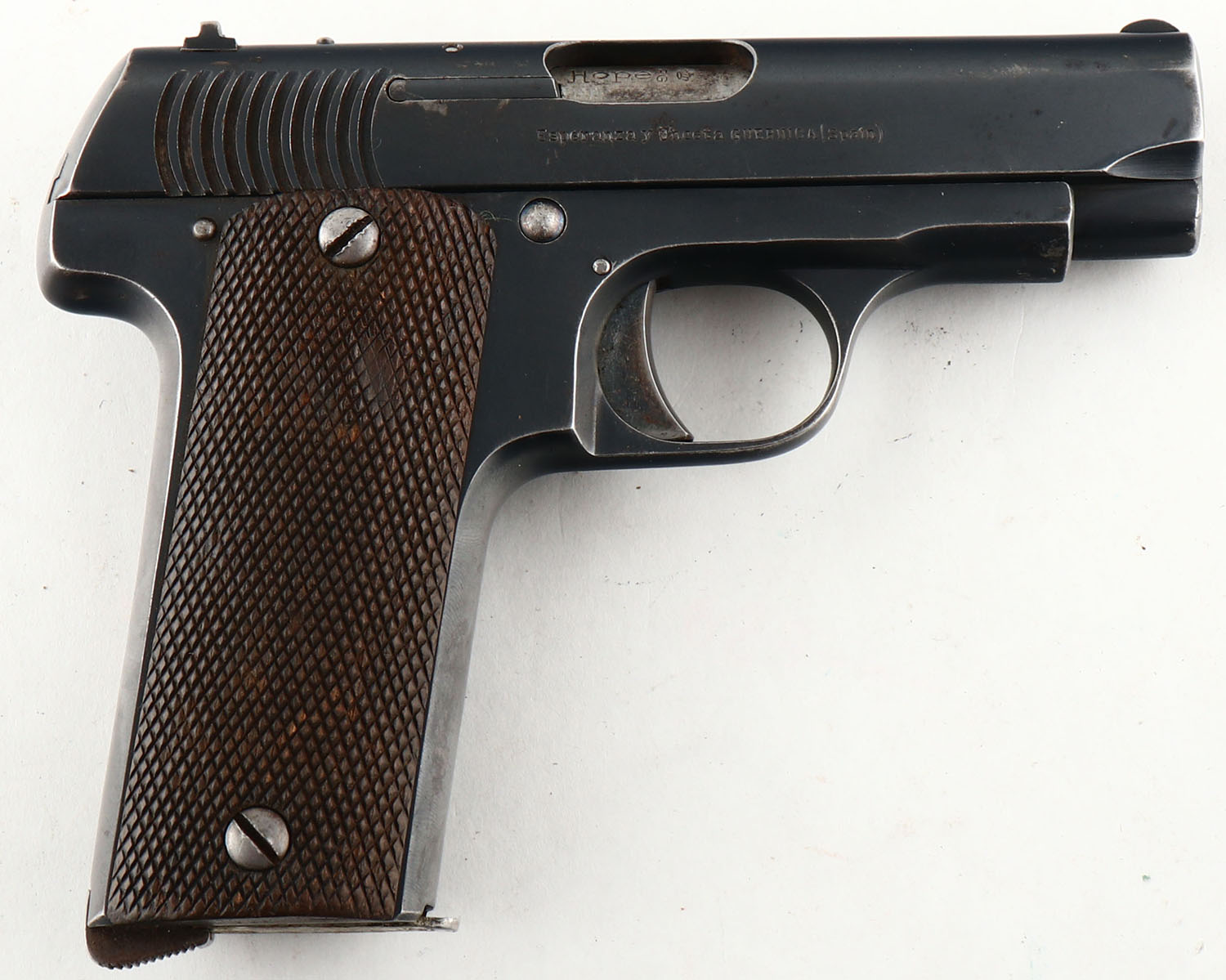 Astra, Model 1916, CAL: 7.65, MFG: 1920's, SN: 77472, Semi Auto Pistol, 3 1/2'' barrel. Standard factory markings. The original checkered wood grips are very good & solid. There are some minor nicks, dings & small areas of smooth checkering. The original metal blue finish rates 85% overall. Bore is good, bright, but consistently rough. Fixed rear sight & blade front sight. Comes with Bauer Bros leather holster. FFL or C&R Req. - Value: 150 to 350