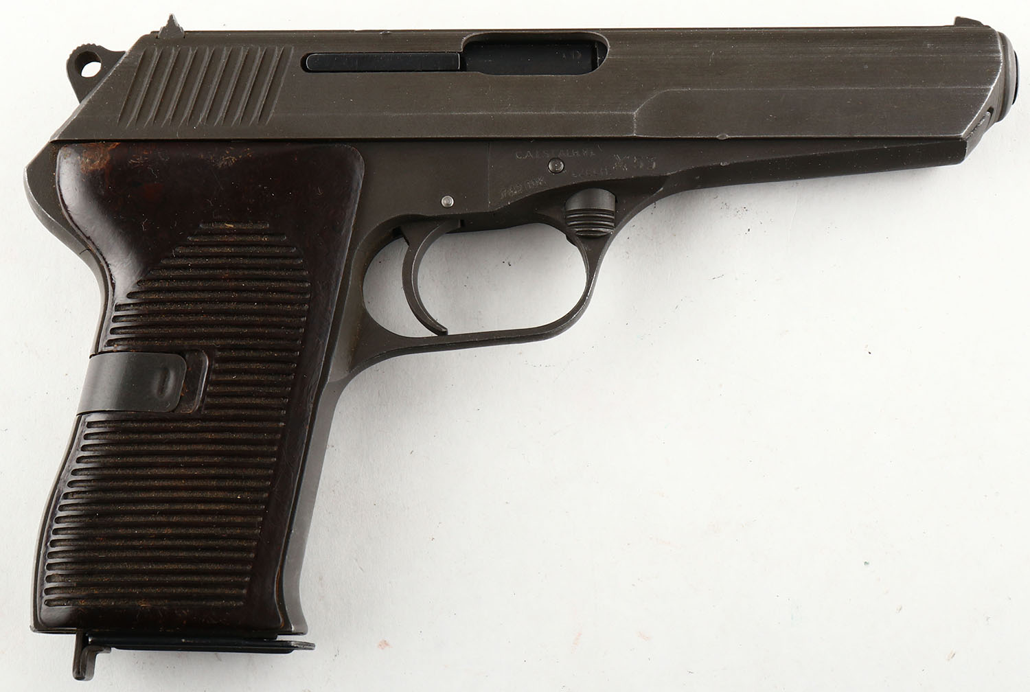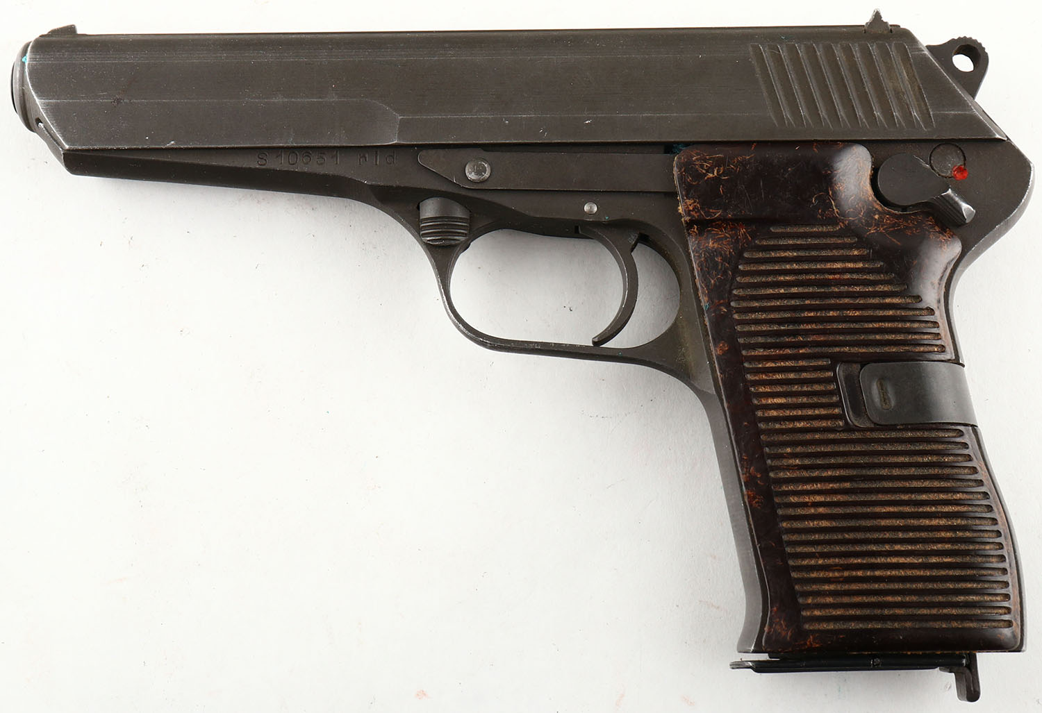 CZ, VZ 52, CAL: 7.62x25 TOKAREV, MFG: 1953, SN: S10651, Semi Auto Pistol, 4 1/2'' barrel. Standard markings on the frame. The Bakelite grooved grips are very good & solid. There is light wear overall. The original matte gray/parkerized finish is very good, with edges worn to metal gray & minor dings/scrapes. Bore is excellent. Fixed u-notch rear sight & blade front sight. Comes with period correct holster, carrying an extra mag & cleaning rod. FFL or C&R Req. - Value: 300 to 600