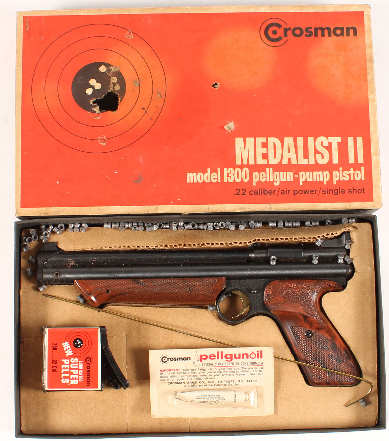 BOXED Crosman, Model 1300 Medalist II, .22 Cal Air Gun, original box with 250 count pellet box, oil tube, & ramrod inside box. Checkered brown plastic grips, blued barrel & cast frame. Gun has a few spots of light rust from long storage, overall in very good condition, box has holes from being used as a target, age soiling & scuff marks. Grade: Very Good + - Value: 50 to 200