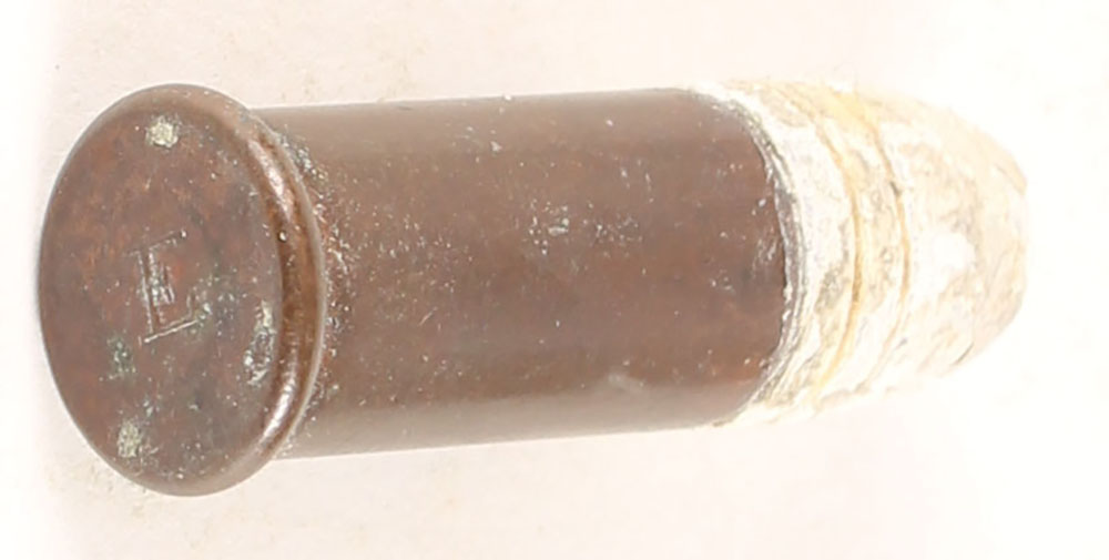 .44 Long RF, Flat pt bullet, H/S: Raised ''E'', oxidized bullet. Grade: Very Good - Value: 50 to 300