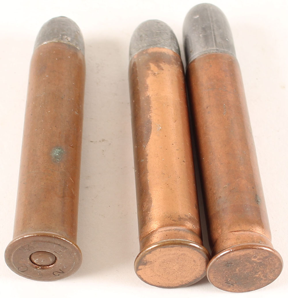 Lot of 3, 45-70 Cart's with RNL, (1) Inside Primed no H/S, (1) Inside Primed 500 Gr Bullet, H/S: RF 1281, (1) Copper Caseand primer, H/S: C 2 85 F. Grade: Excellent - Value: 20 to 40