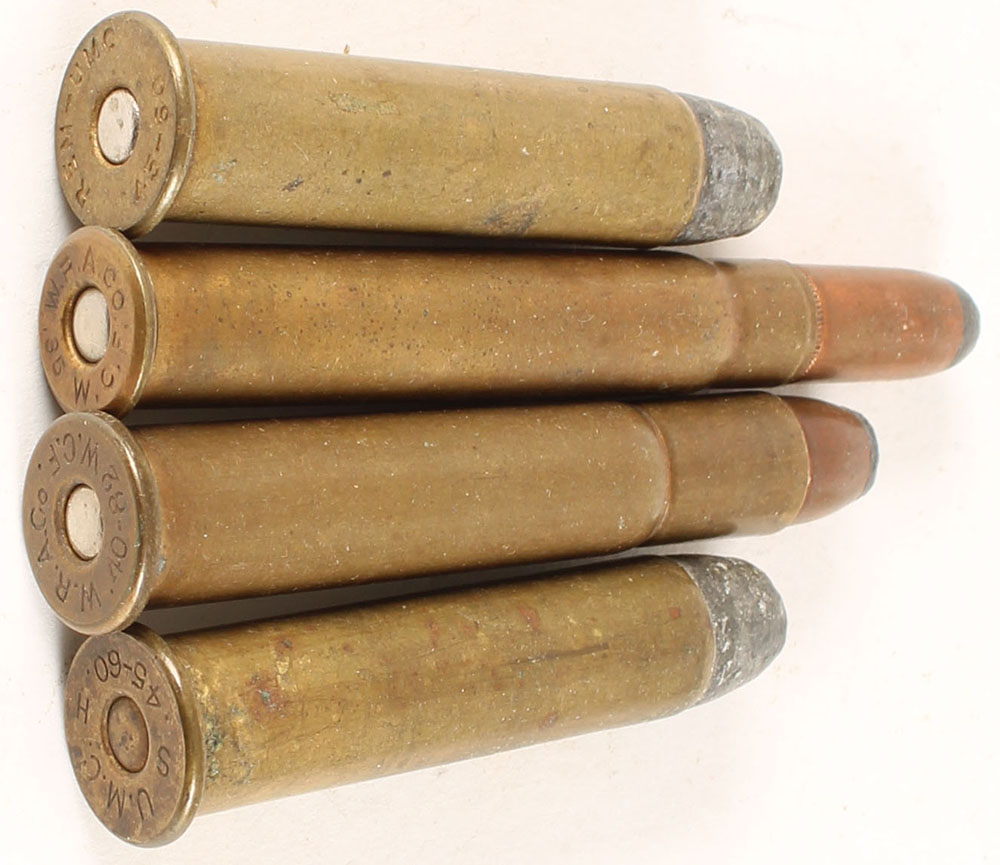 Lot of 4. US Sporting Cartridges. (2) 45-60 WCF: 1--HS:''U.M.C. H 45-60 S'', FN Lead. 1--HS:''REM-UMC 45-60'', FN Lead. (1) 40-82 W.C.F., HS:''W.R.A.Co. 40-82 W.C.F.'', FN CJ SP. (1) 35 WCF, HS:''W.R.A.Co. 35 W.C.F.'', RN CJ SP. Grade Very Good + - Value: 30 to 60