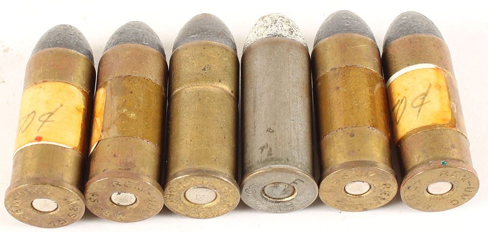 Lot of 6, .45 S&W Cal., (4) H/S: REM-UMC 45 S&W, FN Lead. (1) H/S: REM-UMC 45 COLT, has nickle primer with ''U'', FN Lead. (1) H/S: F 8 92, Tinned case RN. Grade: Very Good + - Value: 10 to 60