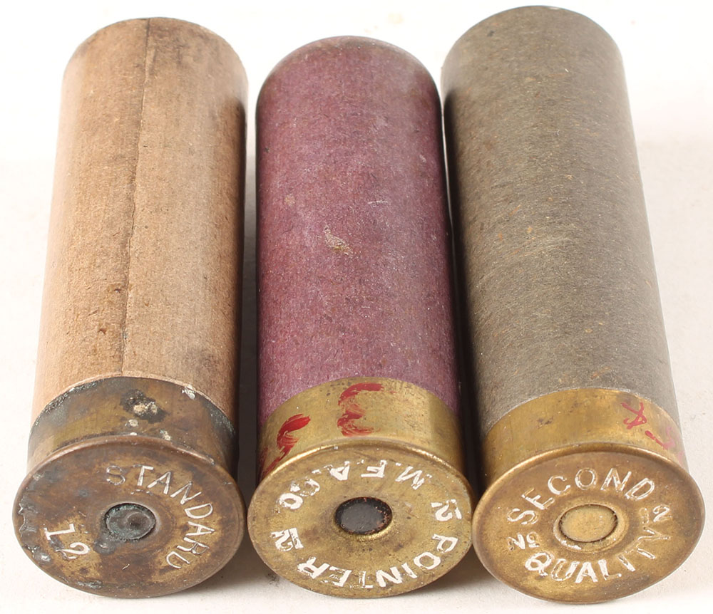 Lot of 3, (1) H/S: ''Pointer M.F.A.Co 12'' loaded purple paper shell, TW: 3- 1 1/8- 4, 2 3/8'' OAL, (1) H/S: ''Second Quality No 12'', NPE, 2 5/8'' OAL, empty black paper case. (1) H/S: ''Standard 12'', NPE, 2 1/2'' OAL, empty tan paper case. Grade: Very Good - Value: 20 to 100