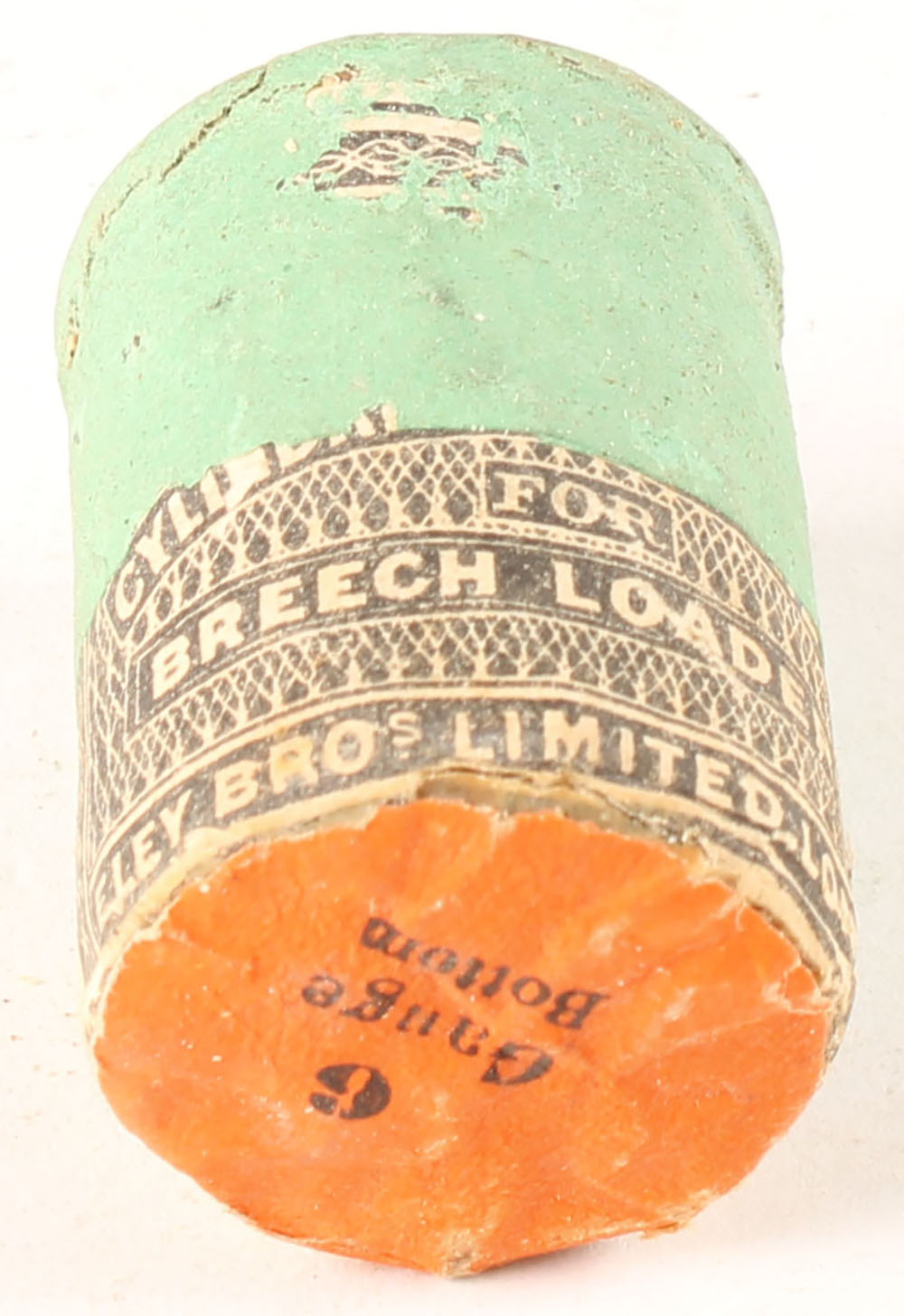 Early Eley's wire and concentrator shot loads. The Eley Brothers began designing shot in the 1820s in London and the company is still in business today and located in Birmingham. Civil Wire Paper wrapped Eley B.B gauge wire shot shell. Base of the cartridge is marked: 6 Gauge Bottom on an orange tag. Grade: Excellent + - Value: 30 to 80