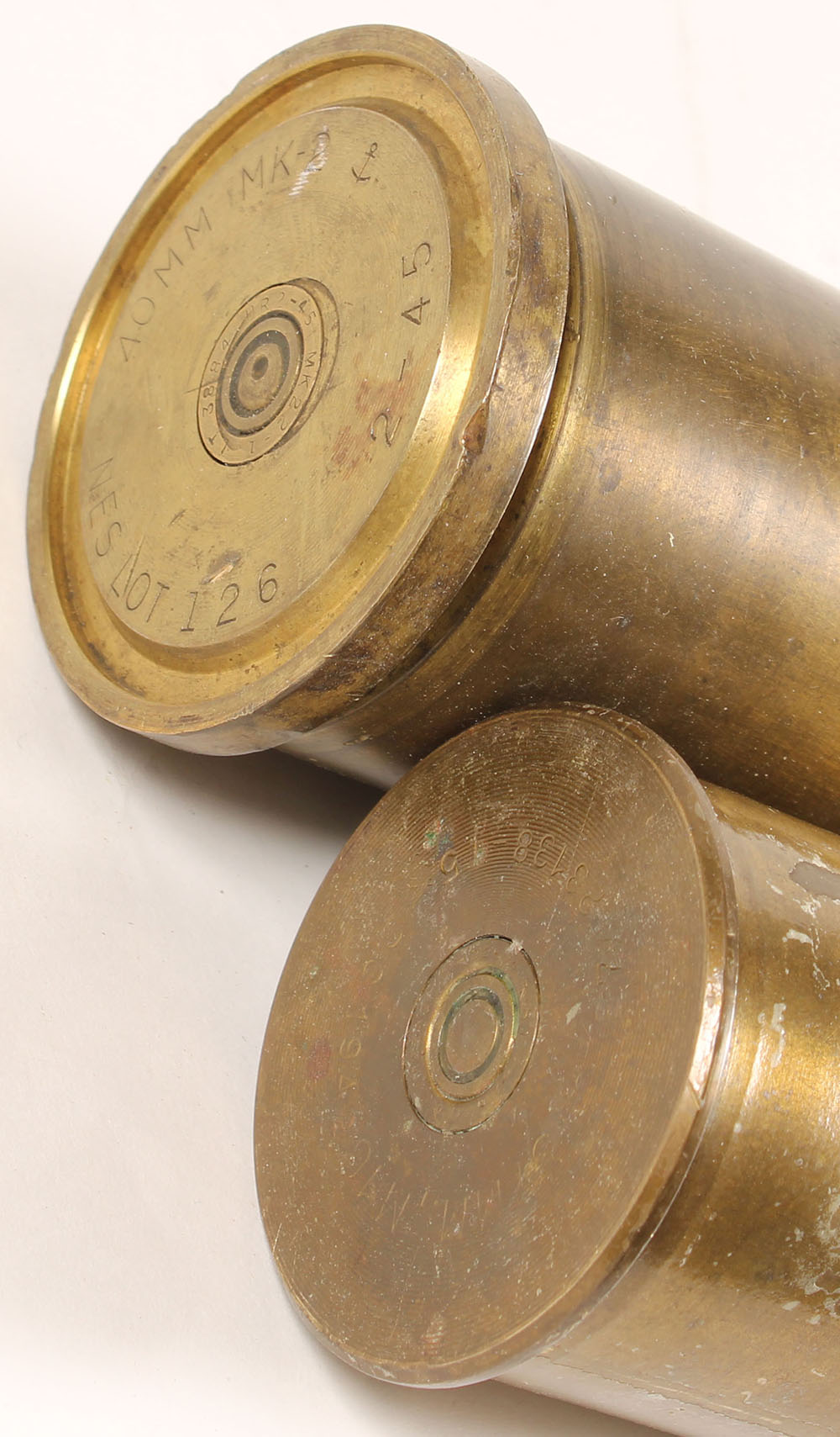 Lot of two, fired shell caseings, one 40mm shell for Bofors AA gun dated 2-1945, one 37mm shell for M3 Anti-tank Gun dated 1942. Grade: Very Good ++ - Value: 10 to 50