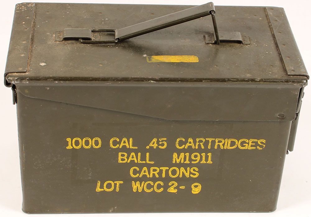 | US, M2A1 .50 Cal metal ammo can, filled with one fired .30-06 pr...
