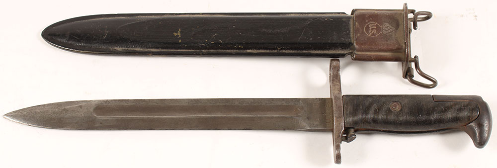 Utica Cutlery Co., M1 Bayonet with sheath/hanger, black grooved grips, metal has toned brown on the guard & pommel, blade has light patina, ricasso marked ''U C'', ''U'' flaming bomb ''S''. The guard is marked ''4 536233''. Grade: Very Good + - Value: 80 to 160