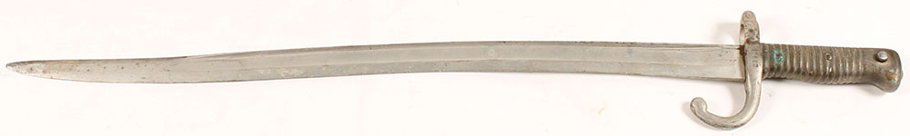French, M1866 Chassepot Yataghan bayonet, blade has corrosion, wear & chips, brass grips have worn/corrode mostly gray, spot of green corrosion on top screw of grips, right side of ricasso marked ''BLECKMANI?'' over ''B'' ''M'' in a bow in arrow, marking is partial faded, left side of guard marked ''23465''. Grade: Good ++ - Value: 80 to 160