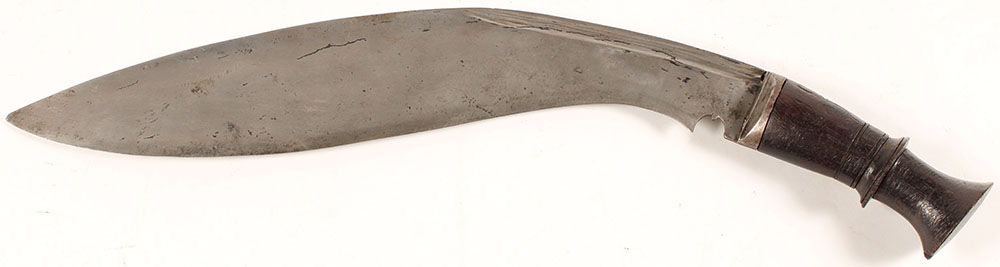 Unmakred, Nepalise Kukri, wood handle has small chips on pommel, bare steel blade with light patina, file/tool marks on back of spine. Grade: Very Good ++ - Value: 60 to 250