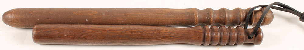 Lot of two wooden police Billy clubs, one has a leather hand strap. Grade: Excellent - Value: 20 to 100
