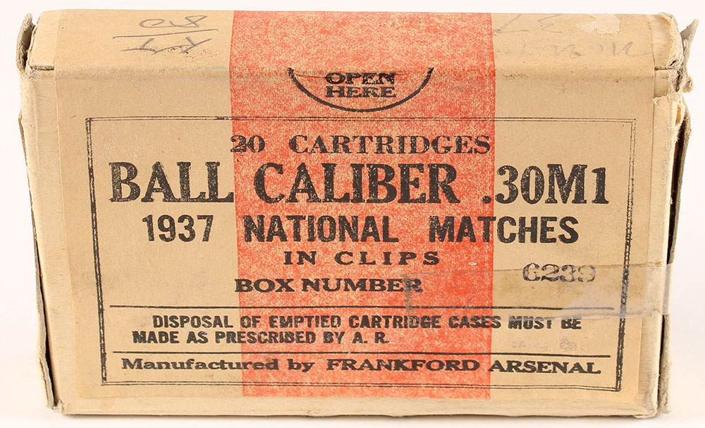 Frankford Arsenal, Ball Caliber .30M1 (.30-06), 1937 National Matches in Clips, Full, 1pc. Buff box with buff & red label, box is sealed but left end factory seam has unadhered, tape on left end, very good to excellent color, minor age soiling, some edge & corner wear, label is intact, ammo appears excellent. Grade: Very Good ++ - Value: 16 to 24