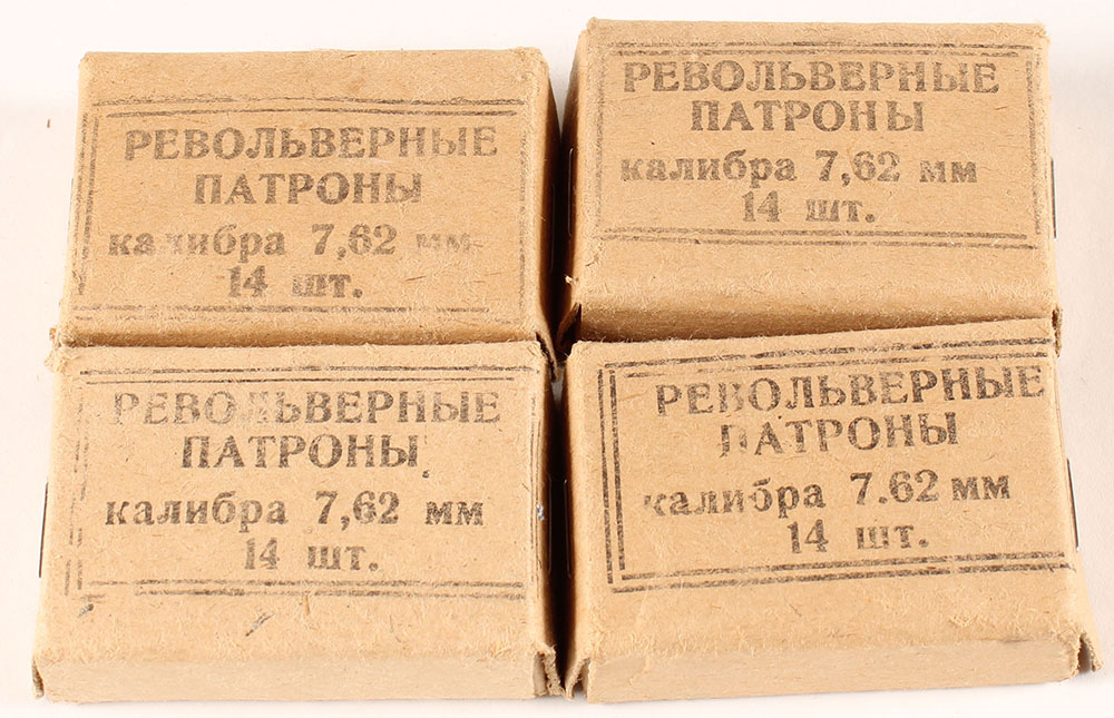 Russian, Lot of (4), 7.62 x 38R Nagant, all boxes FULL & SEALED, 1pc. Buff boxes with black printing, boxes are solid with very good color, some color fading. Grade: Excellent - Value: 40 to 60