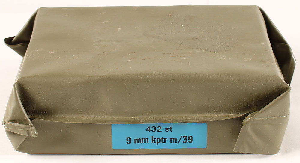 Swedish, SEALED case of 432 Rounds of 9mm kptr m/39, CAUTION: this is special purpose training ammo & could damage a standard 9mm firearm if fired through it. Grade: Excellent ++ - Value: 100 to 300