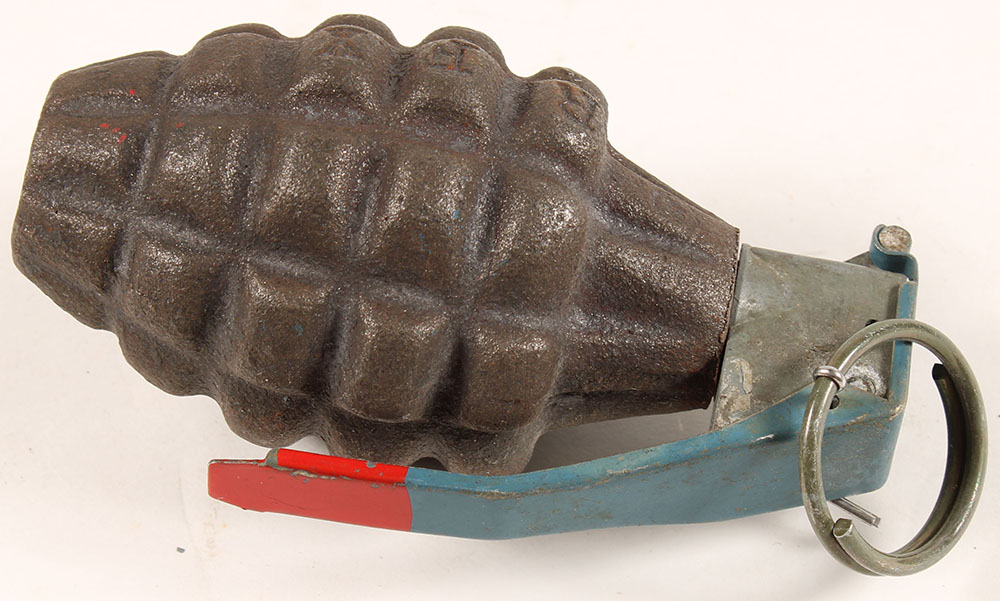 US, Mk2 Pineapple demilled training grenade, has blue spoon with red tip, light corrosion on fuse head. Body marked ''R F X''. Grade: Excellent - Value: 30 to 90