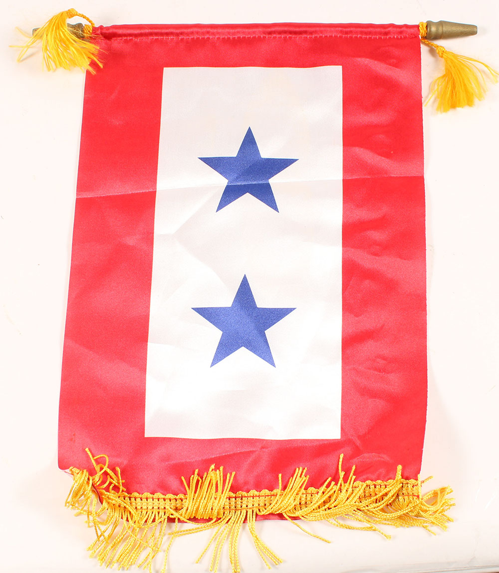 WW2, two star Service banner, these were displayed in household windows in ww2 & the stars showed how many family members were serving. Blue stars mean active duty, & gold stars are for service members who have dies. This is a modern reproduction. Grade: Excellent - Value: 8 to 30