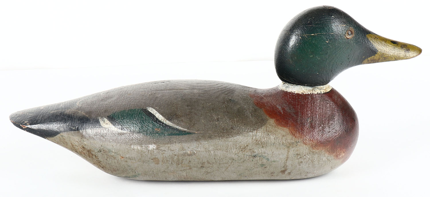 Standard Mallard Drake by Mason Decoy Company, Detroit, MI, 1896-1924. Glass eyes, solid wood, strong all original paint, structurally excellent. Grade: Very Good ++ - Value: 60 to 125