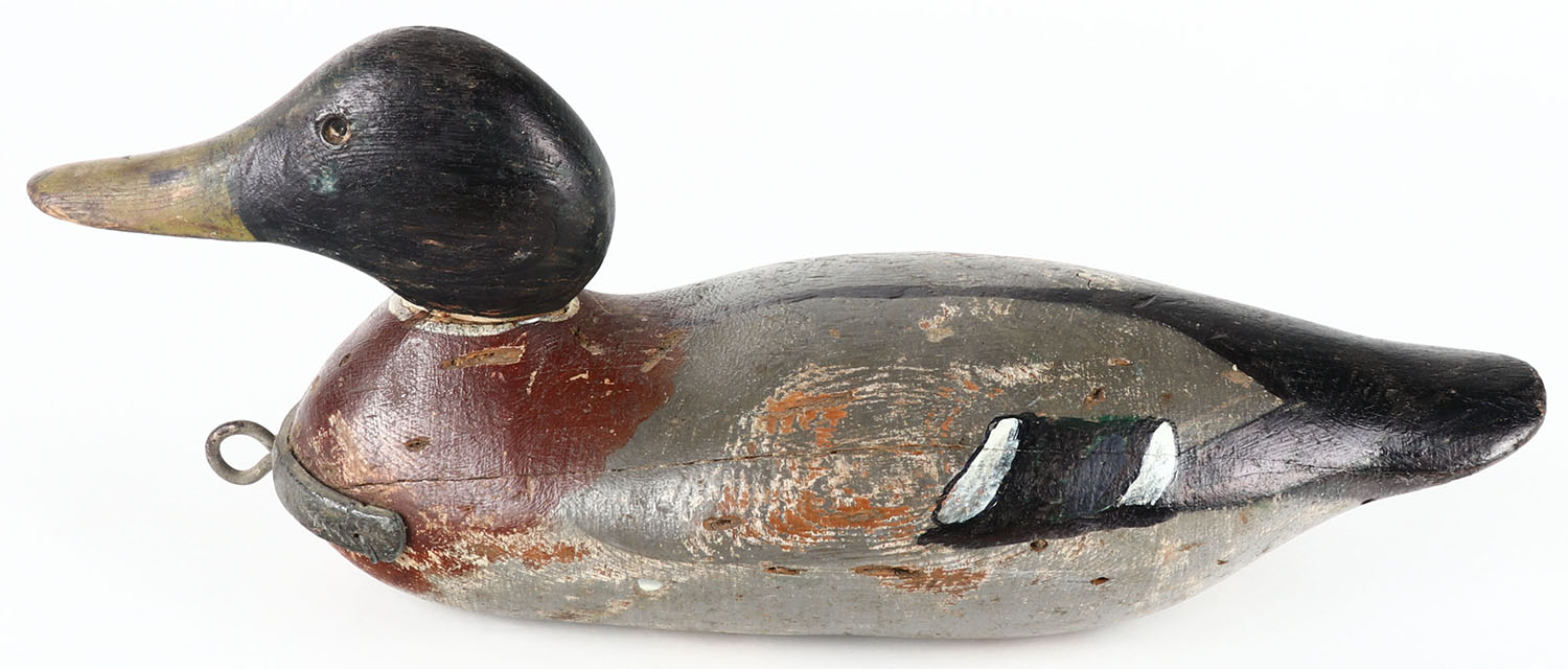 Standard Mallard Drake by Mason Decoy Company, Detroit, MI, 1896-1924. Glass eyes one missing, solid wood, old repaint, structurally excellent, has added lead & line tie to front. Grade: Very Good - Value: 40 to 80