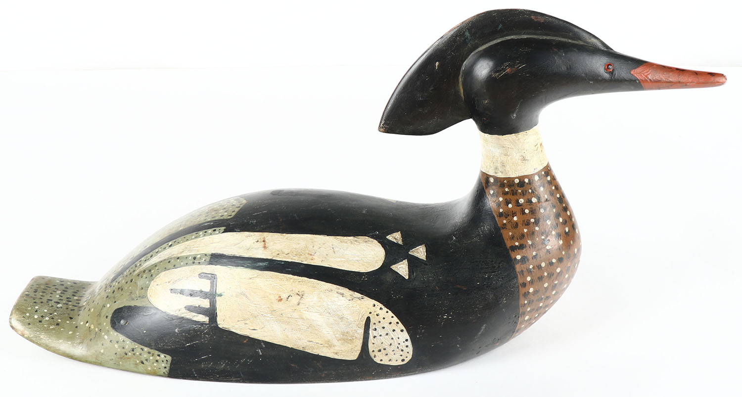 Red Breasted Merganser Drake by P. Winfield, Lunenburg, Nova Scotia, in the style of Edwin Blackman, c1900, PE, solid wood, original paint, branded on bottom PMW, 20'' OAL. Grade: Excellent - Value: 100 to 400