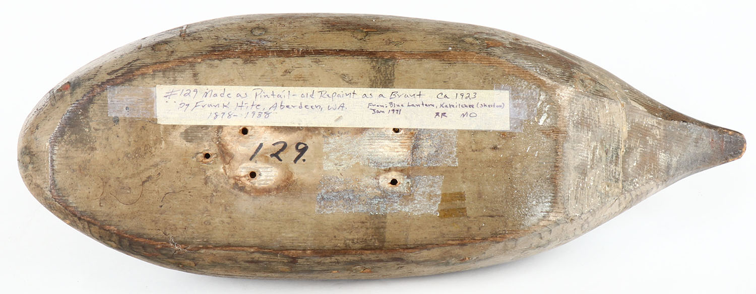 Pintail Drake with old repaint as a Brant, by Frank Hite, Aberdeen, WA, c1923, GE, hollow wood, repaint, has crack to neck & missing neck filler, 20'' OAL. Grade: Very Good + - Value: 50 to 150