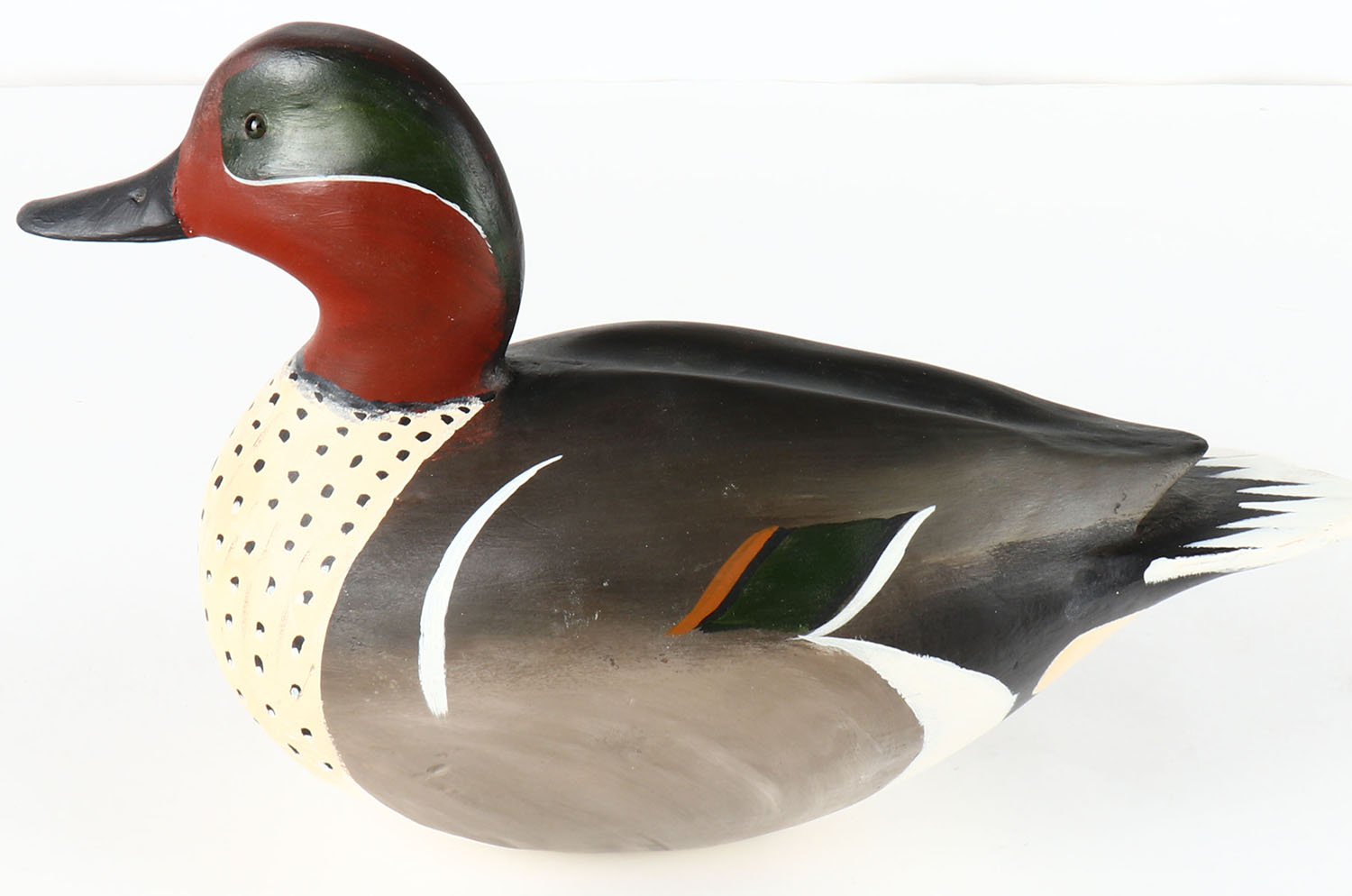 Green Wing Teal Drake by Bill William Goenne, King City, CA, glass eyes, solid wood on stake no stand, original paint, structurally excellent, 13 1/2'' OAL. Grade: Excellent ++ - Value: 100 to 200