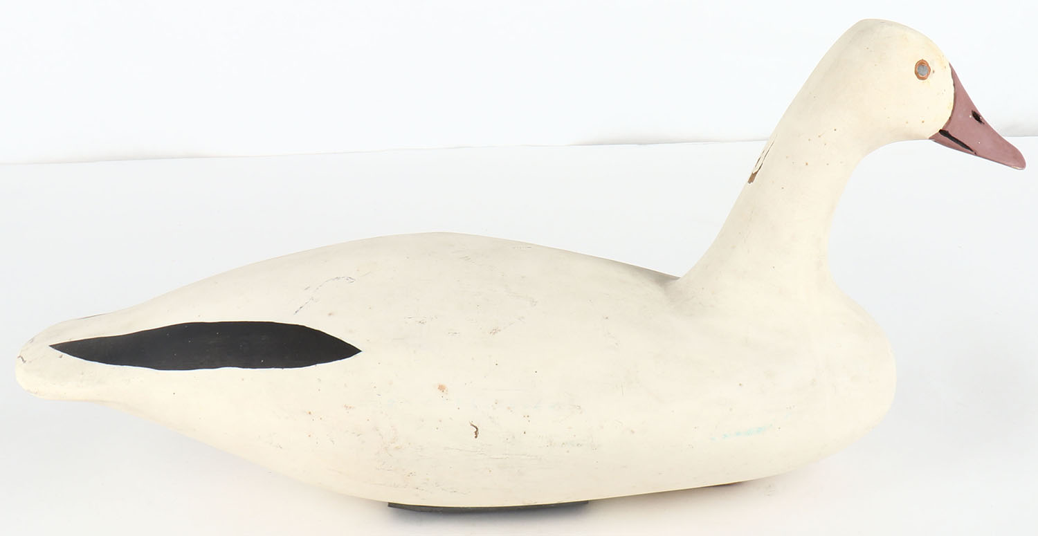 Snow Goose by Robert G Litzenberg, Elkton, MD, PE, solid wood, original paint, structurally excellent, signed on bottom lead weight, 20'' OAL. Grade: Excellent - Value: 150 to 350