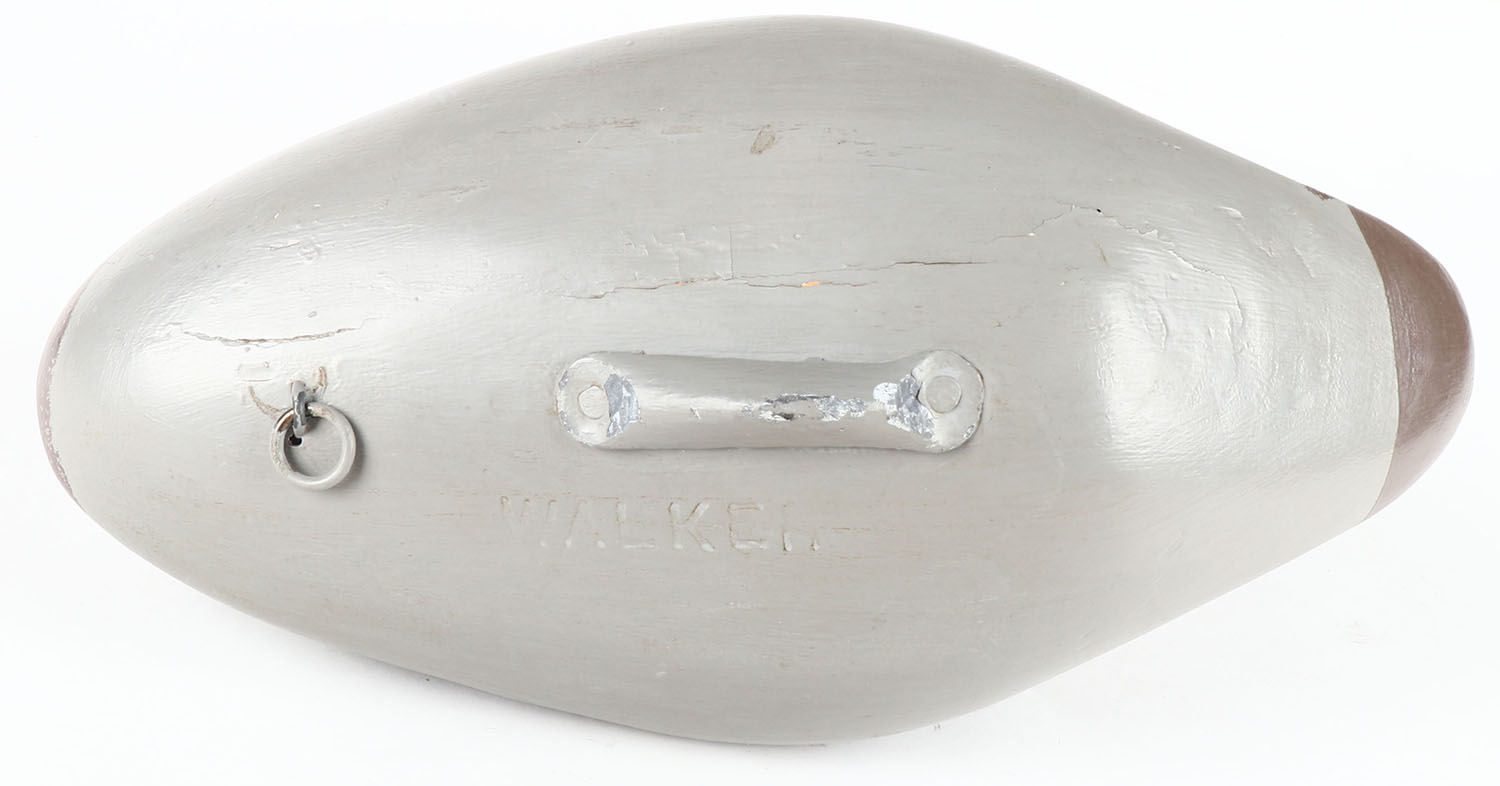 Preening Canvasback Hen by David Walker, MD, painted eyes, solid wood, original paint, structurally excellent, branded on bottom ''WALKER'', 13''. Grade: Excellent - Value: 30 to 60