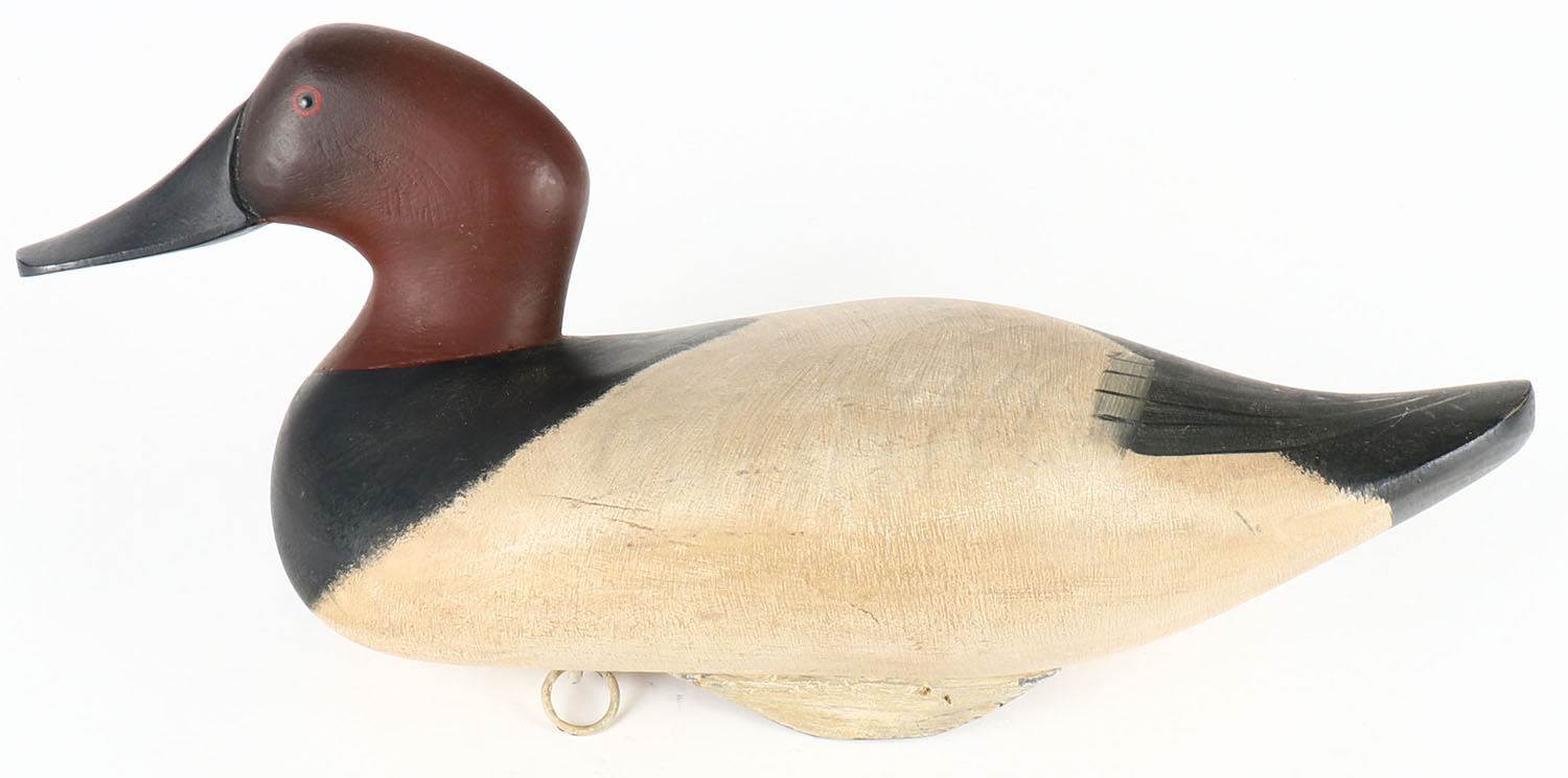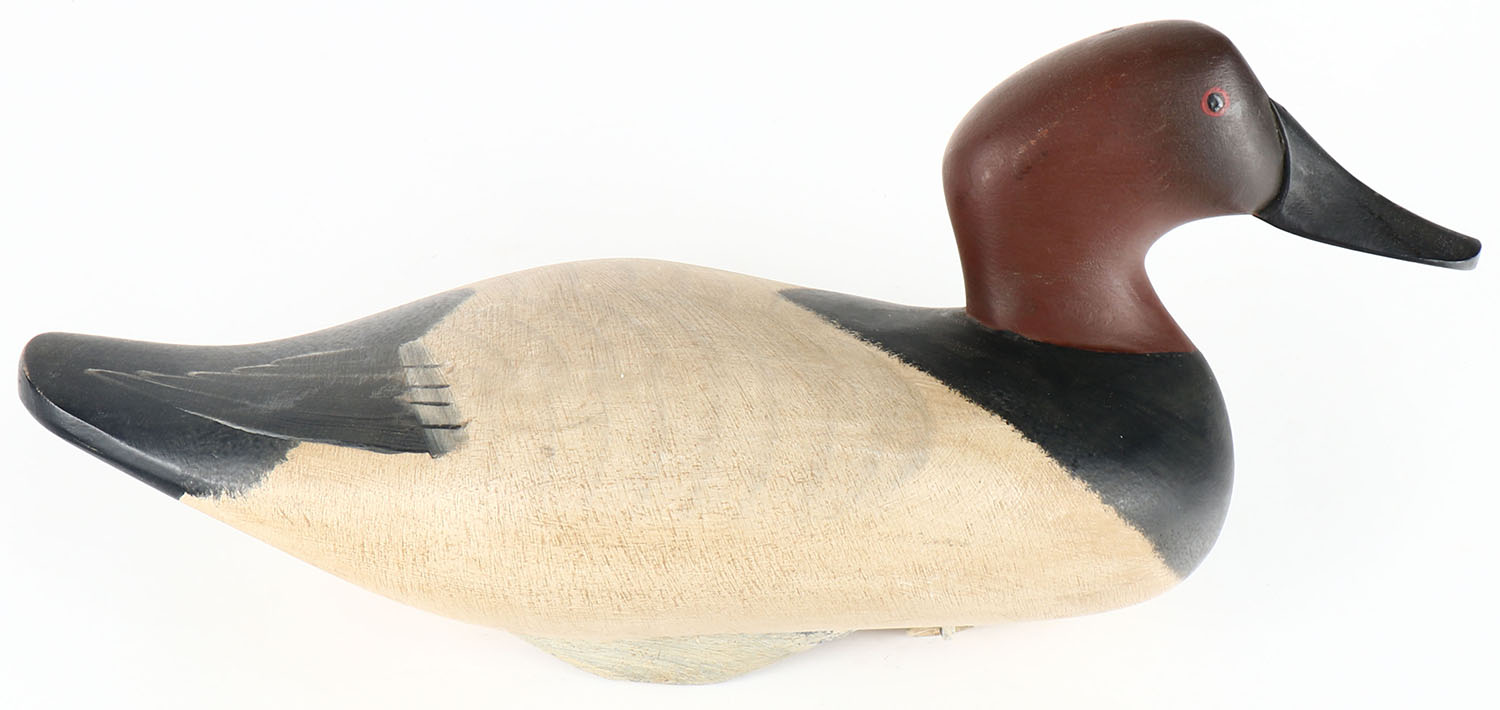 Canvasback Drake by Gilmore B. Wagoner, Havre De Grace, MD, painted eyes, solid wood, original paint, structurally excellent, signed on bottom, 16'' OAL. Grade: Excellent + - Value: 50 to 100