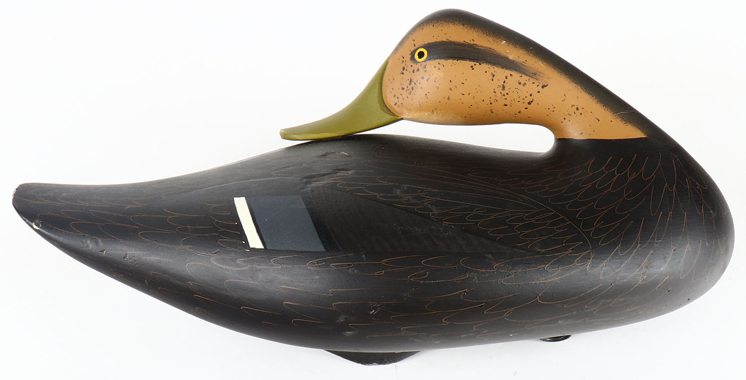 Preening Black Duck by Patrick ''Pat'' Vincent, Churchville, MD, painted eyes, solid wood, original paint, structurally excellent, signed on bottom, 14'' OAL. Grade: Excellent ++ - Value: 40 to 80