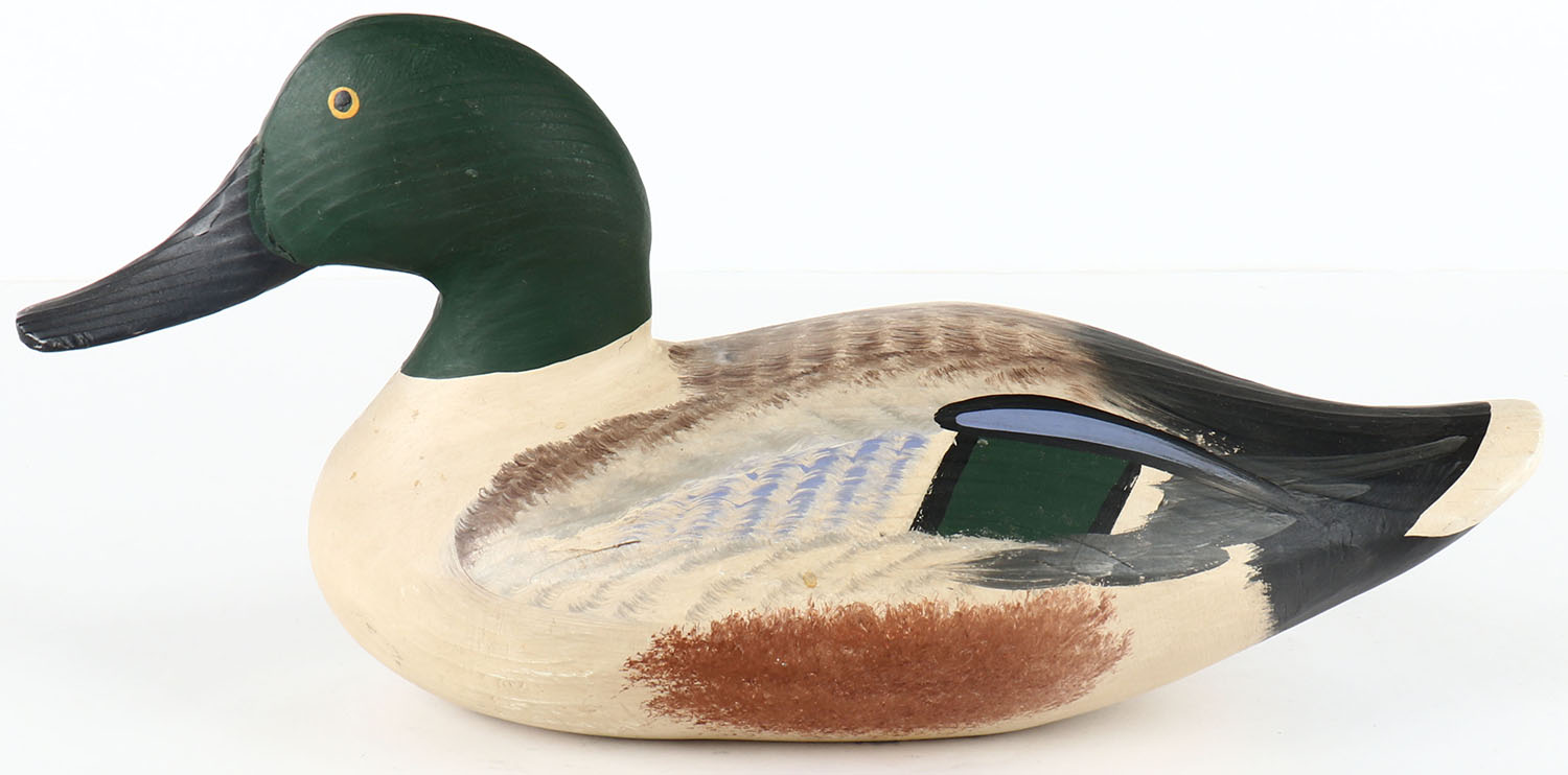 Shoveler Drake by Lorn Bry???, PE, original paint, solid wood, structurally excellent, signed on bottom, 14'' OAL. Grade: Excellent - Value: 30 to 90