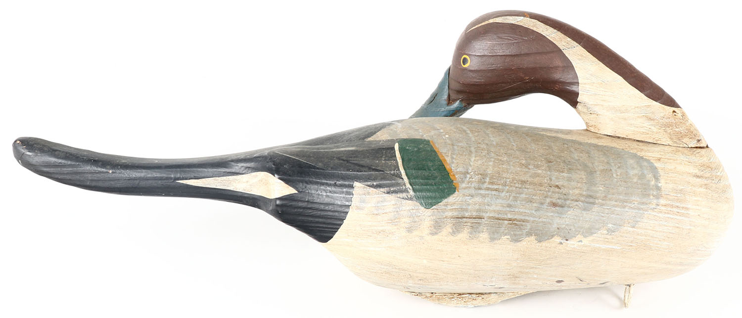 Preening Pintail Drake by Capt. Vernon Bryant, Perryville, MD, painted eyes, solid wood, original paint, structurally excellent, branded BRYANT on bottom. Grade: Excellent + - Value: 30 to 60