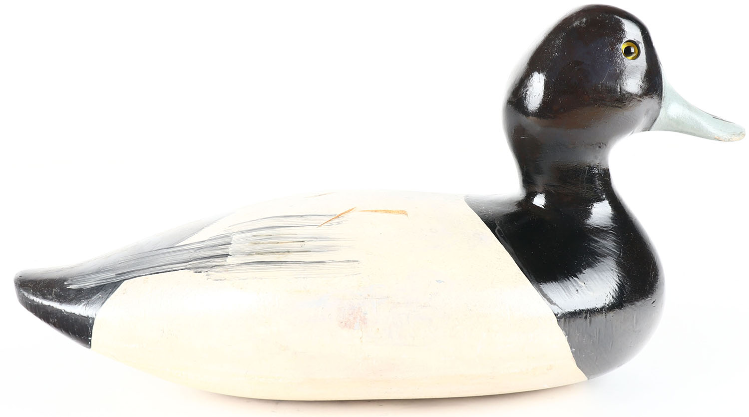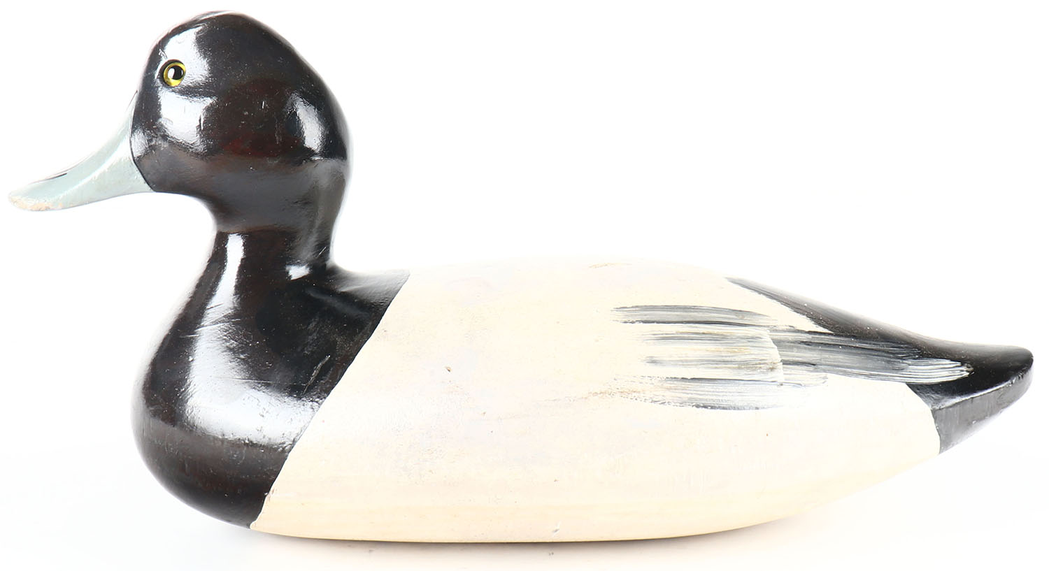 Bluebill Drake marked with Ducks Unlimited brand, GE, solid wood, original paint, structurally excellent, branded with DU name on bottom. Grade: Excellent + - Value: 30 to 60