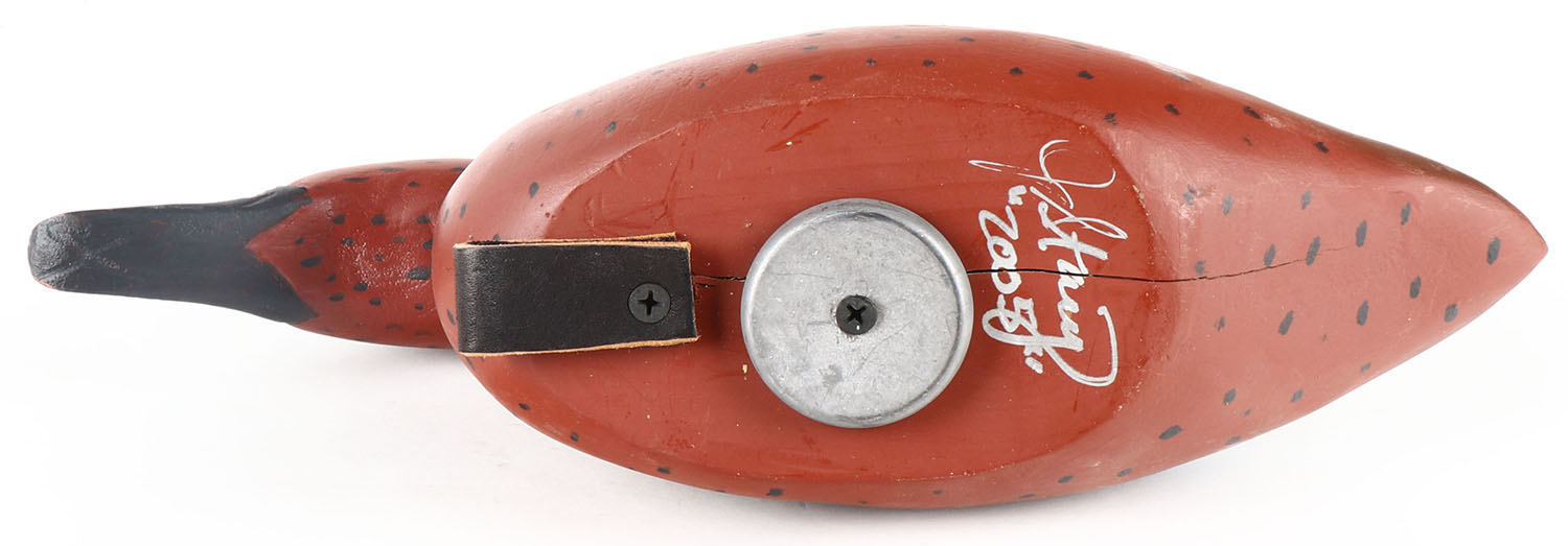 Swimming Cinnamon Teal by J. Stacy, GE, solid wood, original paint, structurally excellent, signed on bottom, 13'' OAL. Grade: Excellent + - Value: 20 to 70