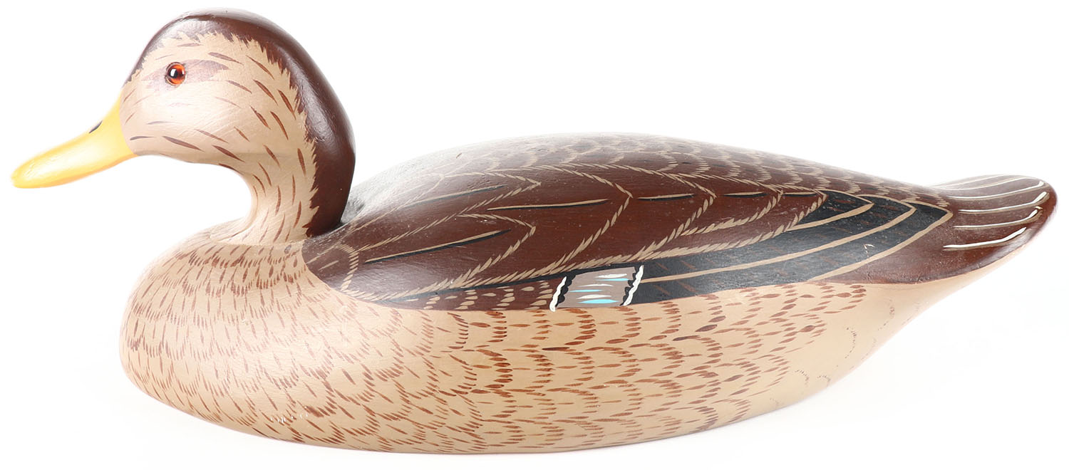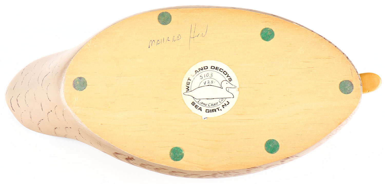 Mallard Hen by Wet Land Decoys Sea Girt, NJ, GE, solid wood, original paint, structurally excellent, signed JT under bill, 15'' OAL. Grade: Excellent + - Value: 20 to 60