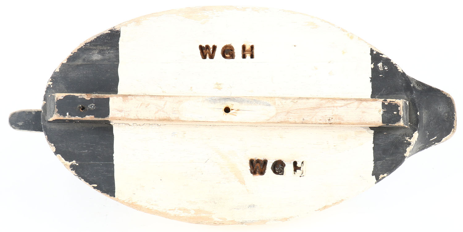 Canvasback Drake by unknown maker, branded WGH, GE, hollow wood with bottom board, original paint, structurally excellent, 15'' OAL. Grade: Very Good + - Value: 40 to 80