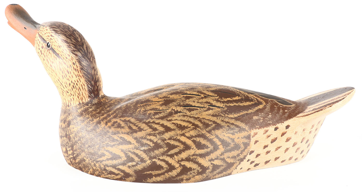 Mallard Hen by Mike Smyser Decoys, GE, hollow wood, original paint, structually excellent, 18 1/2'' OAL. Grade: MINT - Value: 40 to 100