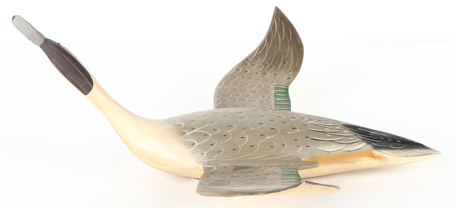 Flying Pintail Drake by Jimmy Bowden, Chincoteague, VA, GE, solid wood, original paint, structurally excellent, 17 1/2'' OAL. Grade: Excellent - Value: 50 to 100