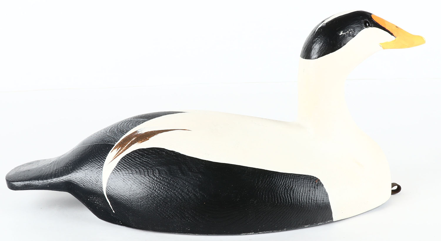 Eider by Tom Martindale, Ontario, Canada, glass eyes, solid wood, original paint, structurally excellent, branded TM & signed on bottom, 17 1/2'' OAL. Grade: MINT - Value: 50 to 100