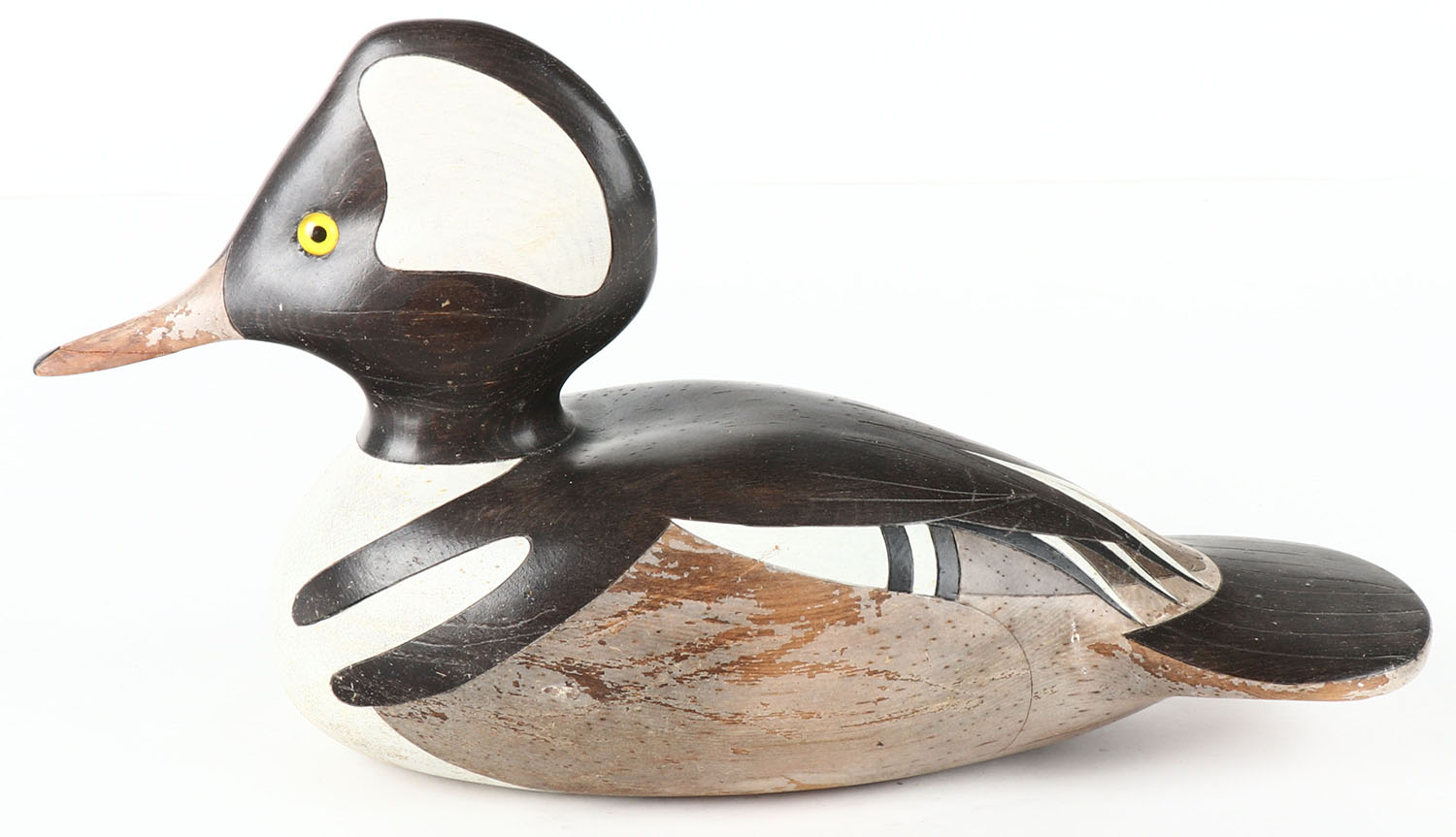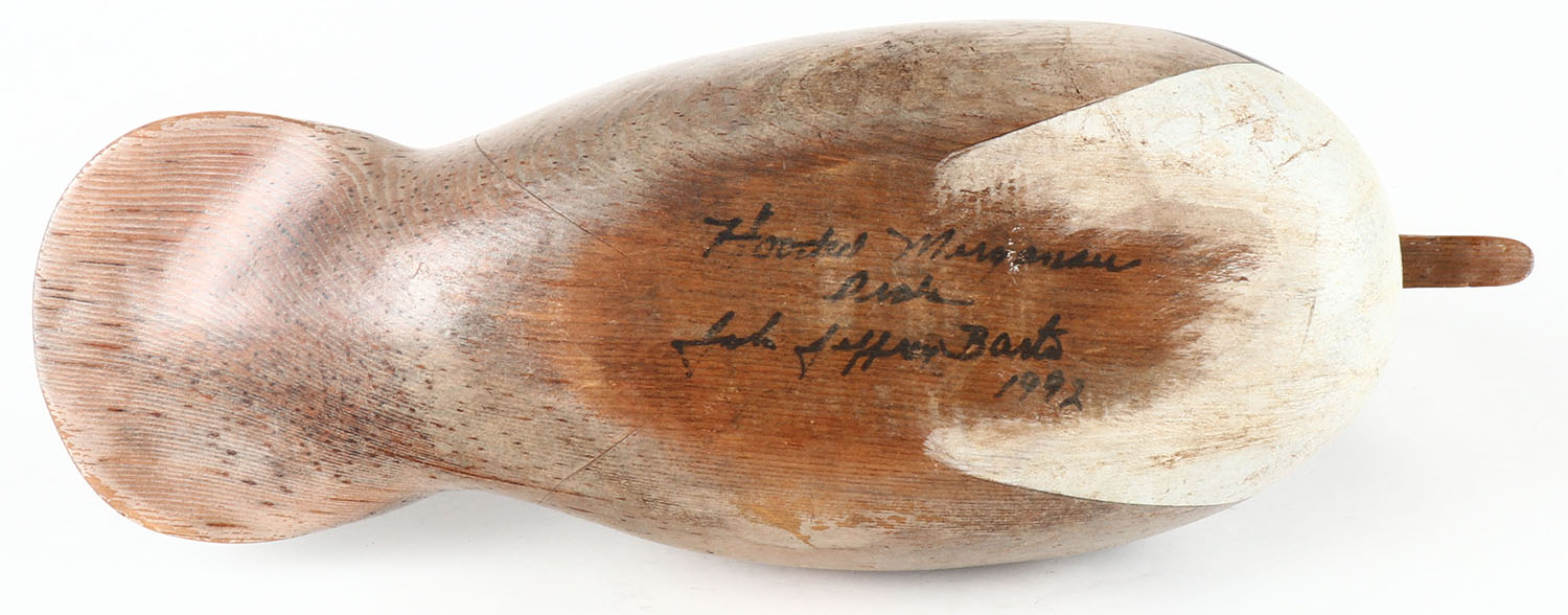 Hooded Merganser by John Jeffery Barts, GE, solid wood, original paint, bill has repaired crack at tip. Grade: Very Good ++ - Value: 20 to 60
